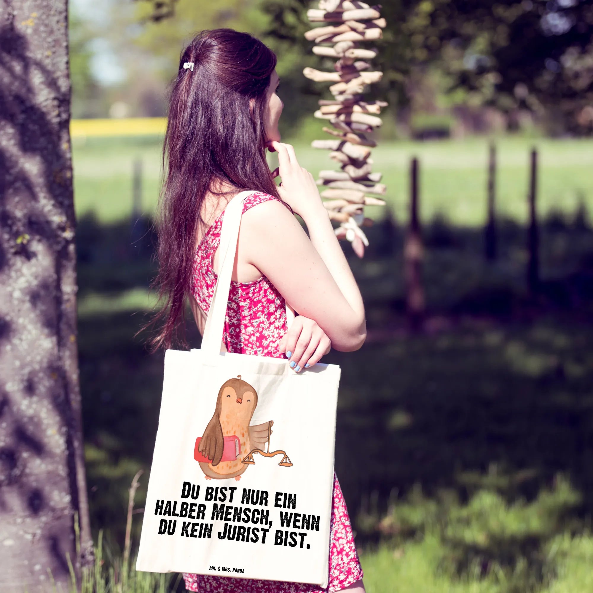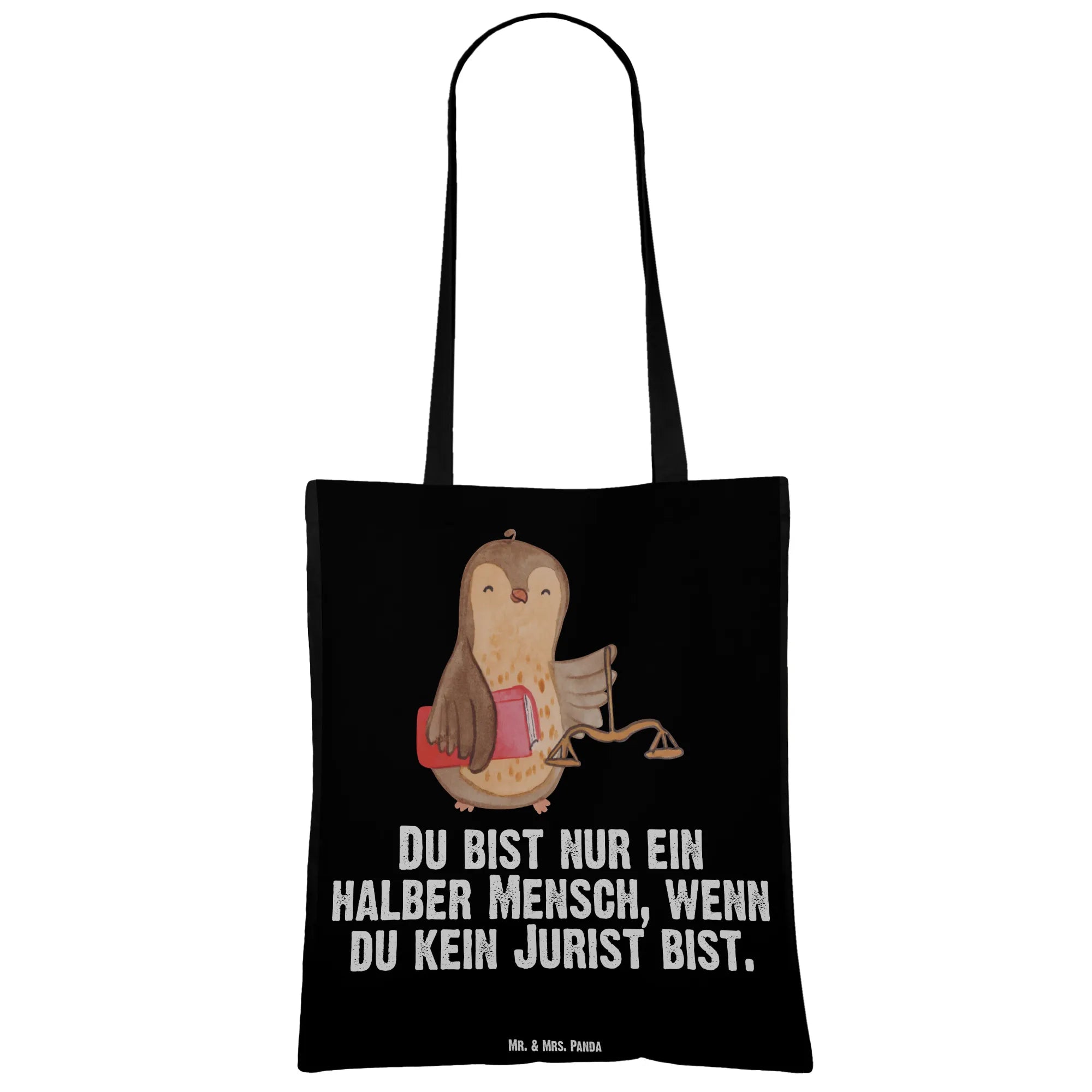 Diese hochwertige Baumwolltasche ist nicht nur stylisch, sondern auch äußerst praktisch. Mit dem süßen Motiv einer kleinen Eule, die ein Gesetzbuch hält, und dem Slogan "Du bist nur ein halber Mensch, wenn du kein Jurist bist" trifft sie genau den richtigen Ton. Egal, ob für einen Abschluss, das bestandene Staatsexamen oder einfach als liebevolles Geschenk für einen kommissarischen Kollegen – diese Tasche ist ein Must-Have für jeden Juristen!