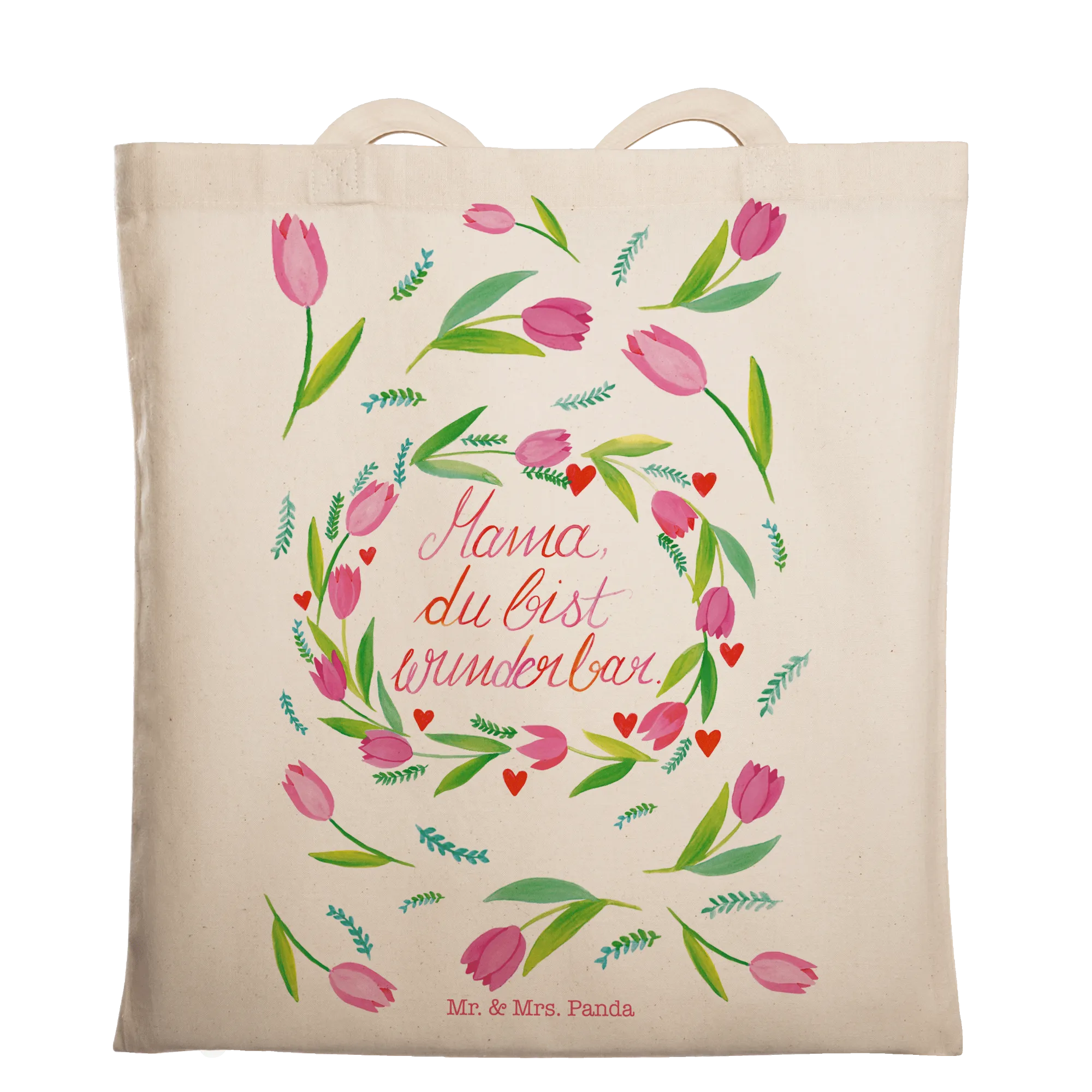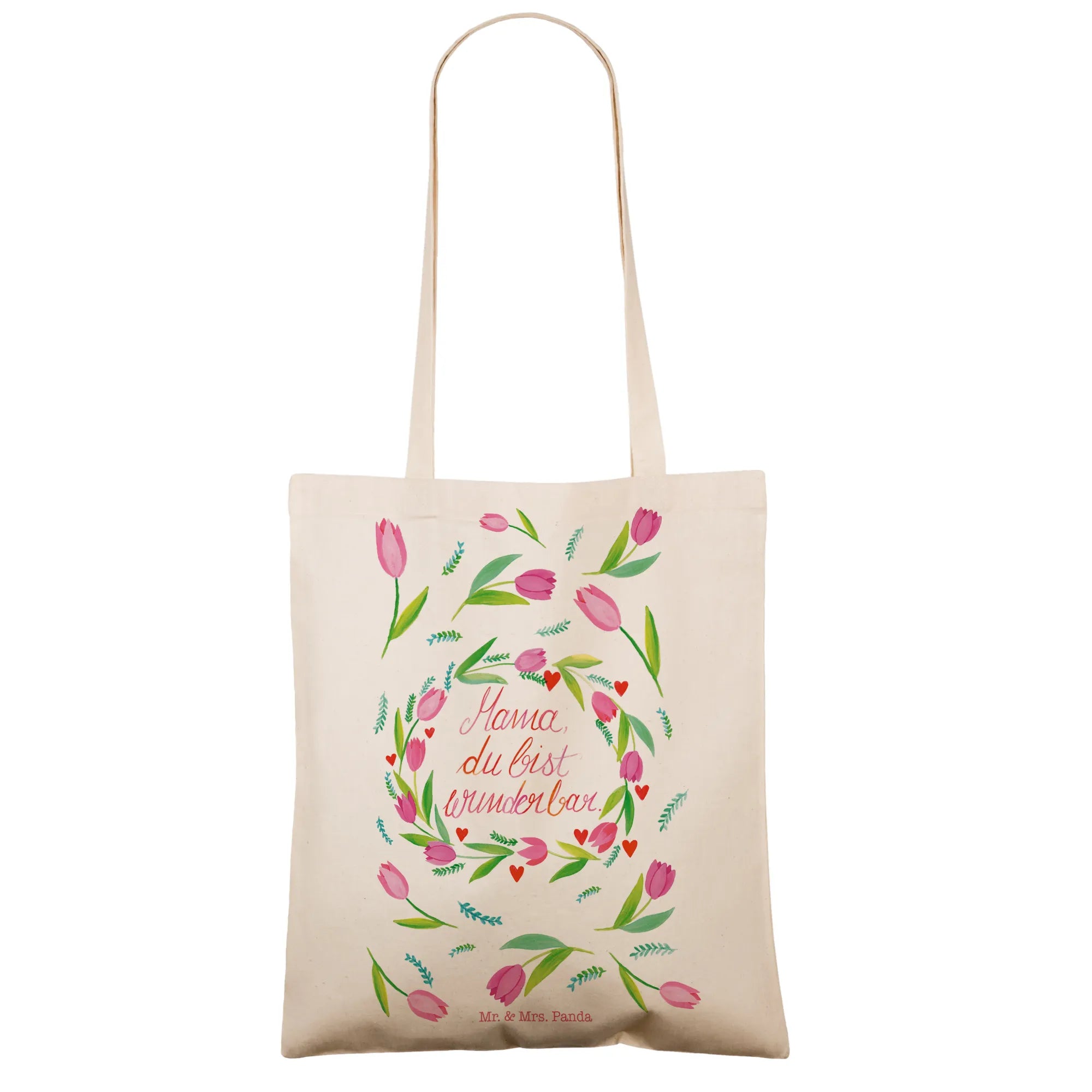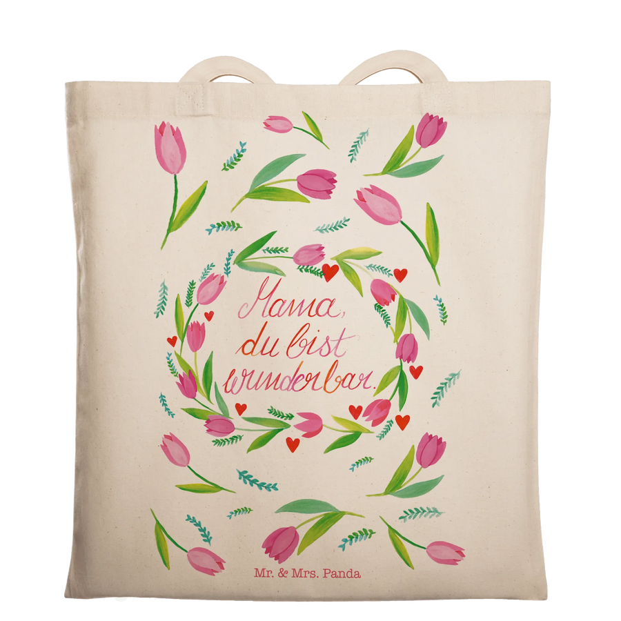 Die Tragetasche Mama Tulpen aus der Wild & Free Kollektion von Mr. & Mrs. Panda ist der perfekte Begleiter für jede Mama! Sie ist nicht nur hübsch, sondern auch äußerst praktisch. Hergestellt aus hochwertiger, naturbelassener Öko-Baumwolle, ist diese umweltfreundliche Tasche bei 140g/m² besonders leicht und doch robust.