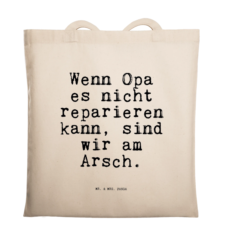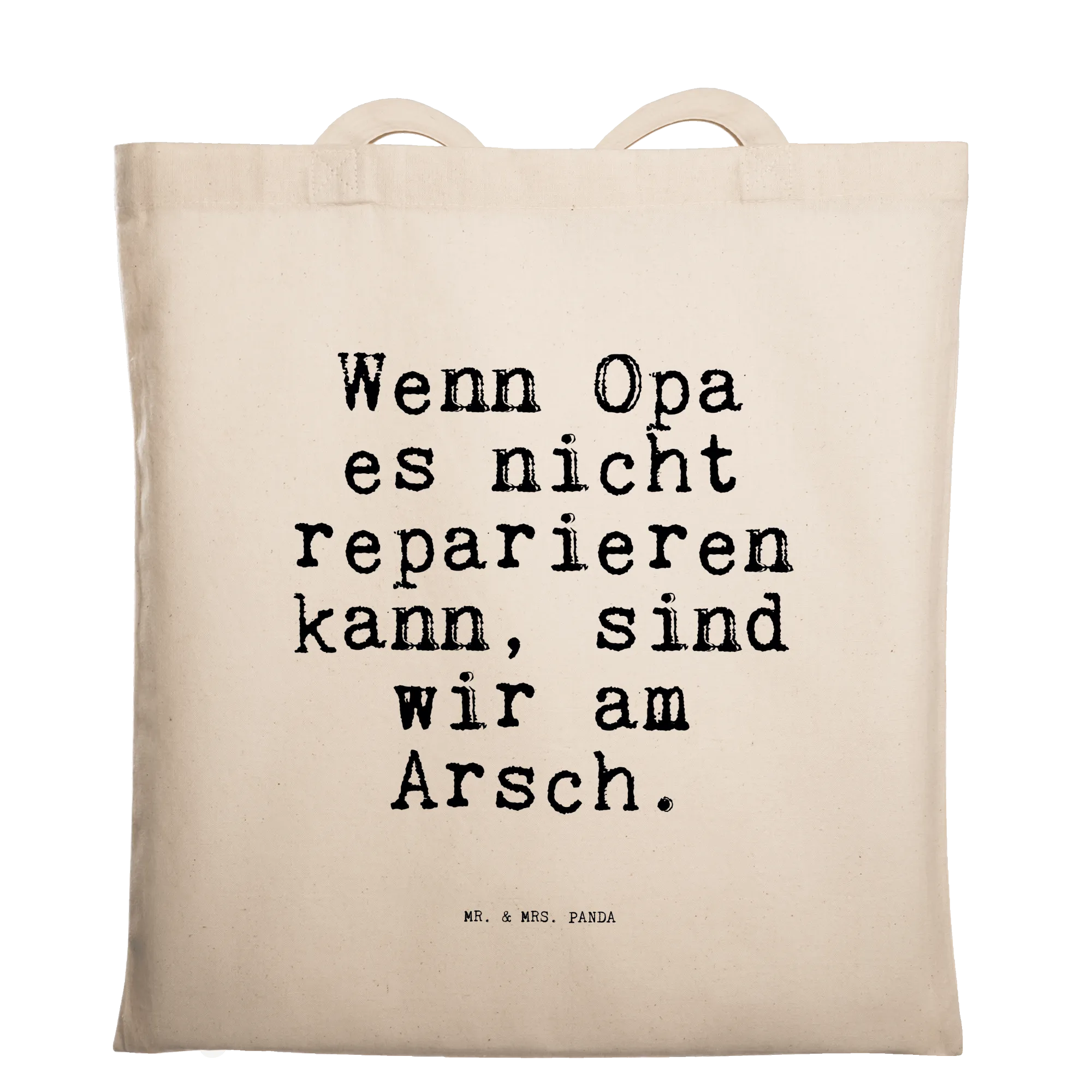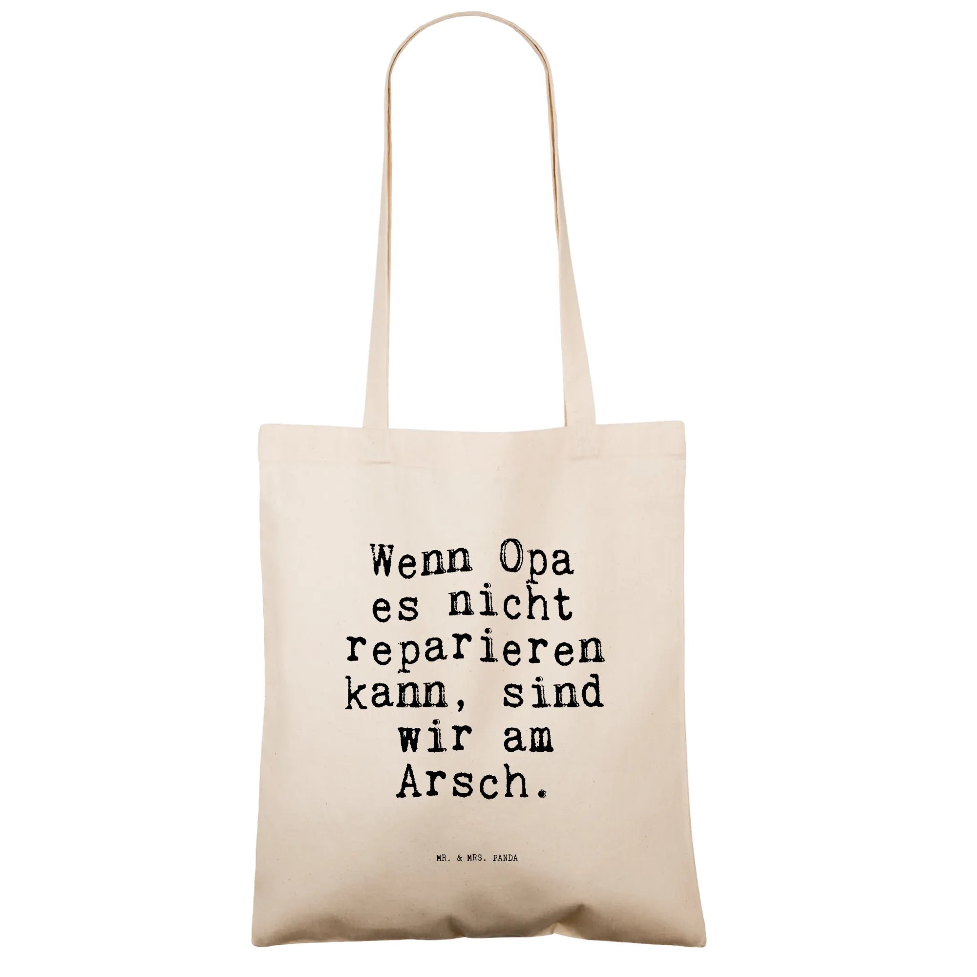 Die Tragetasche von Mr. & Mrs. Panda ist nicht nur ein praktischer Begleiter im Alltag, sondern auch ein liebevolles Geschenk, das jedem Opa ein Lächeln ins Gesicht zaubert! Mit dem witzigen Spruch 'Wenn Opa es nicht reparieren kann, sind wir am Arsch.' bringt sie eine Prise Humor in jede Einkaufstour.