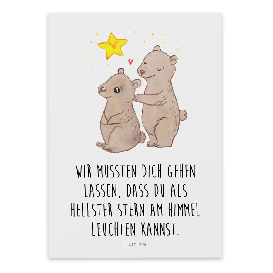 Die Trauerzeit ist eine der schwierigsten Phasen im Leben, besonders wenn man einen geliebten Menschen oder ein ungeborenes Kind verliert. Unsere "Bäreneltern Sternenkind" Trauerkarte zeigt die traurigen, aber auch liebevollen Momente zweier Bäreneltern, die ihren Verlust erlitten haben. Auf der Frontseite findest du den herzzerreißenden Spruch: "Wir mussten dich gehen lassen, dass du als hellster Stern am Himmel leuchten kannst." Dieses Zitat bringt den Schmerz des Verlustes und die Hoffnung auf das Wiedersehen in den Sternen wunderschön zum Ausdruck.