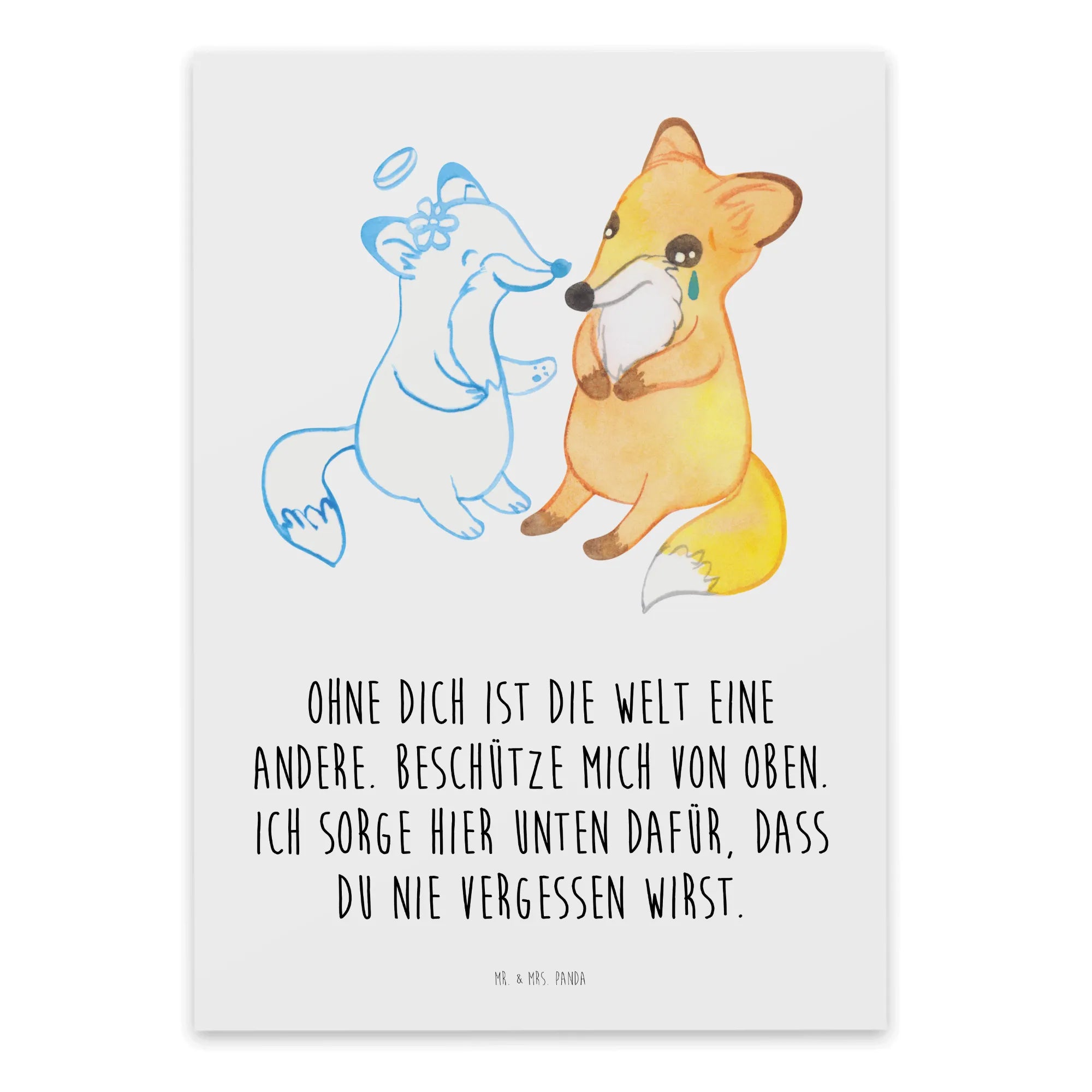 Das einfühlsame Motiv zeigt einen traurigen Fuchs, der an seine verstorbene Schwester denkt. Ihre Anwesenheit wird in Form einer Wolke symbolisiert, sodass das Bild die Verbundenheit zwischen den beiden unterstreicht. Am unteren Rand befindet sich eine liebevolle Botschaft: „Ohne dich ist die Welt eine andere. Beschütze mich von oben. Ich sorge hier unten dafür, dass du nie vergessen wirst.“ Diese Worte bieten einen Hauch von Hoffnung und Trost, wenn die Zeit schwer wird.