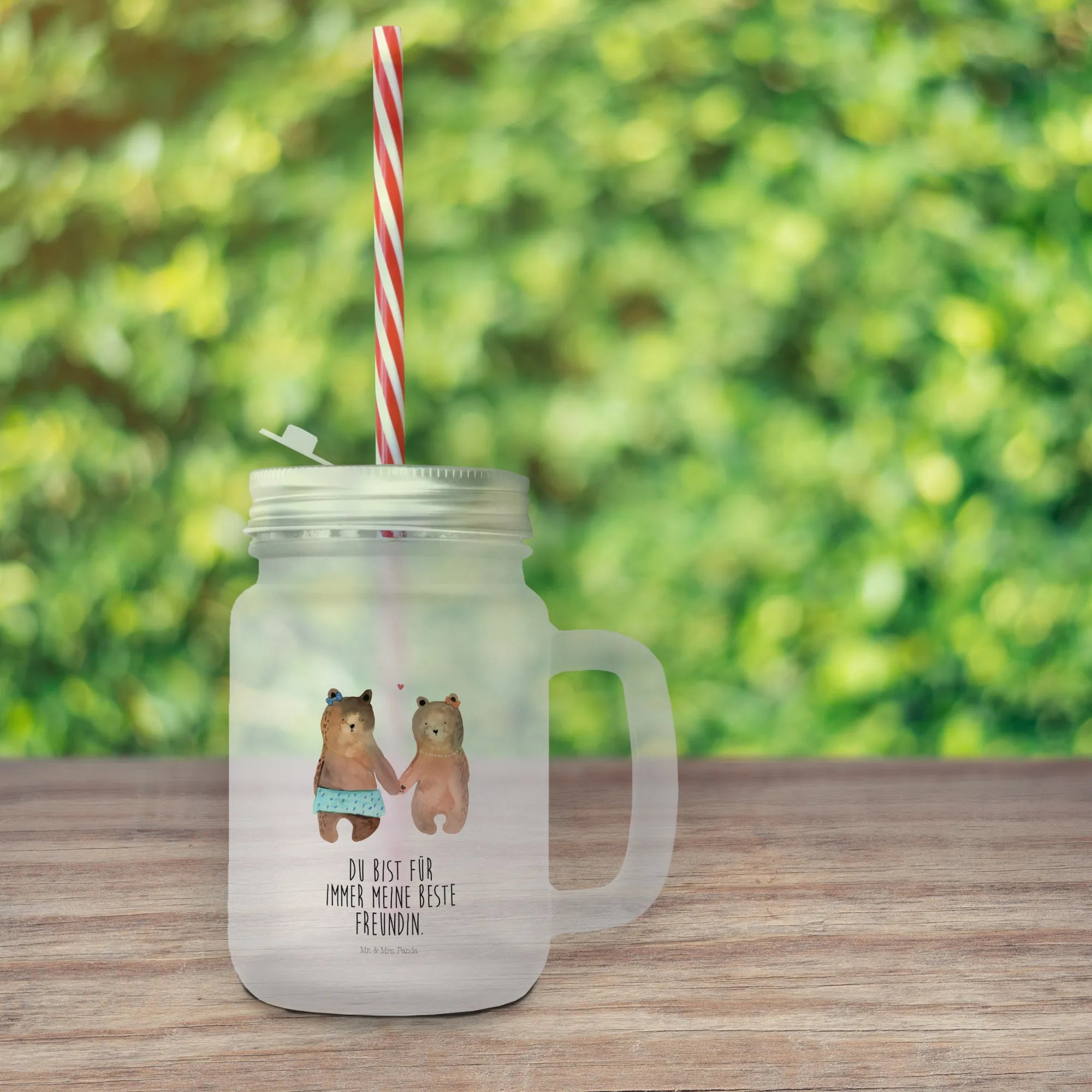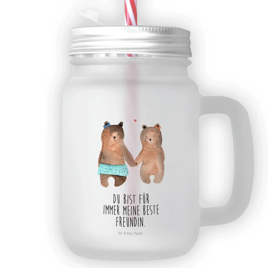 Das wundervolle Trinkglas Mason Jar von Mr. & Mrs. Panda mit dem liebevollen Motiv Bär Freundin ist das perfekte Geschenk für deine beste Freundin oder für jeden, der süße Bären und Freundschaft liebt. Dieses hochwertige, satiniertes Glas hat eine edle, matte Oberfläche und ist ideal für all deine Lieblingsgetränke im Sommer. Egal, ob du erfrischende Cocktails, hausgemachte Limonade oder leckeren Eistee zubereitest, mit diesem Trinkglas wird jeder Schluck zu einem Genuss.