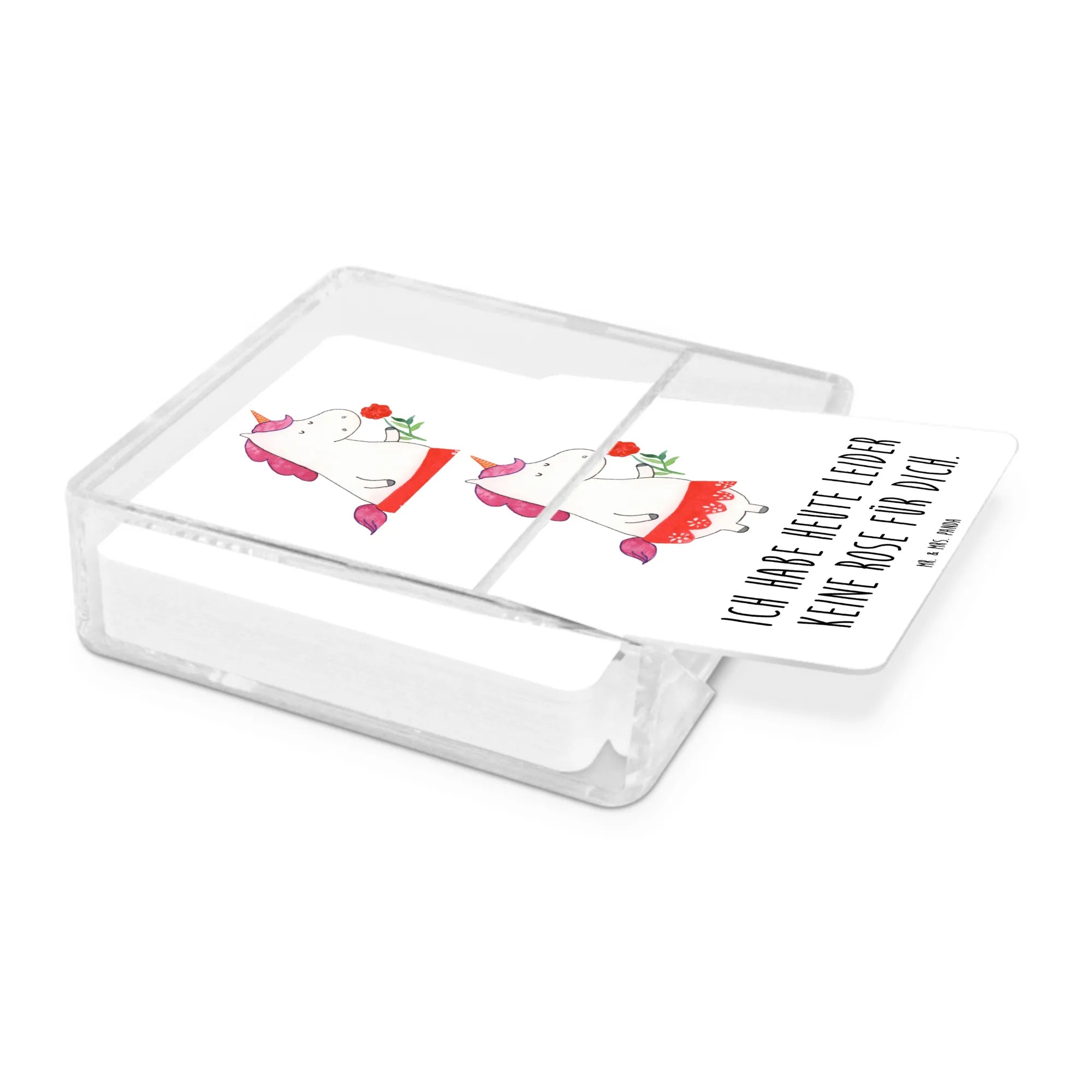 Stell dir vor, du triffst eine feine Dame: Ein süßes Einhorn, das mit seinem strahlenden Horn und seinem glänzenden Fell jeden Raum erhellt. Dieses Einhorn ist nicht nur schön, sondern auch stark in seiner Aussage. Mit dem Motiven-Slogan "Ich habe heute leider keine Rose für dich" zeigt es, dass es wichtig ist, klare Grenzen zu setzen. In einer Welt voller Ablenkungen weiß dieses Einhorn, wann es Zeit ist, Schluss zu machen, und das verdient Respekt. Es erinnert uns daran, dass Trennungen manchmal notwendig sind, um an unserem eigenen Glück festzuhalten. Lass dieses charmante Einhorn deine Freundin sein und dir helfen, dein Herz zu schützen und für dich selbst einzustehen.