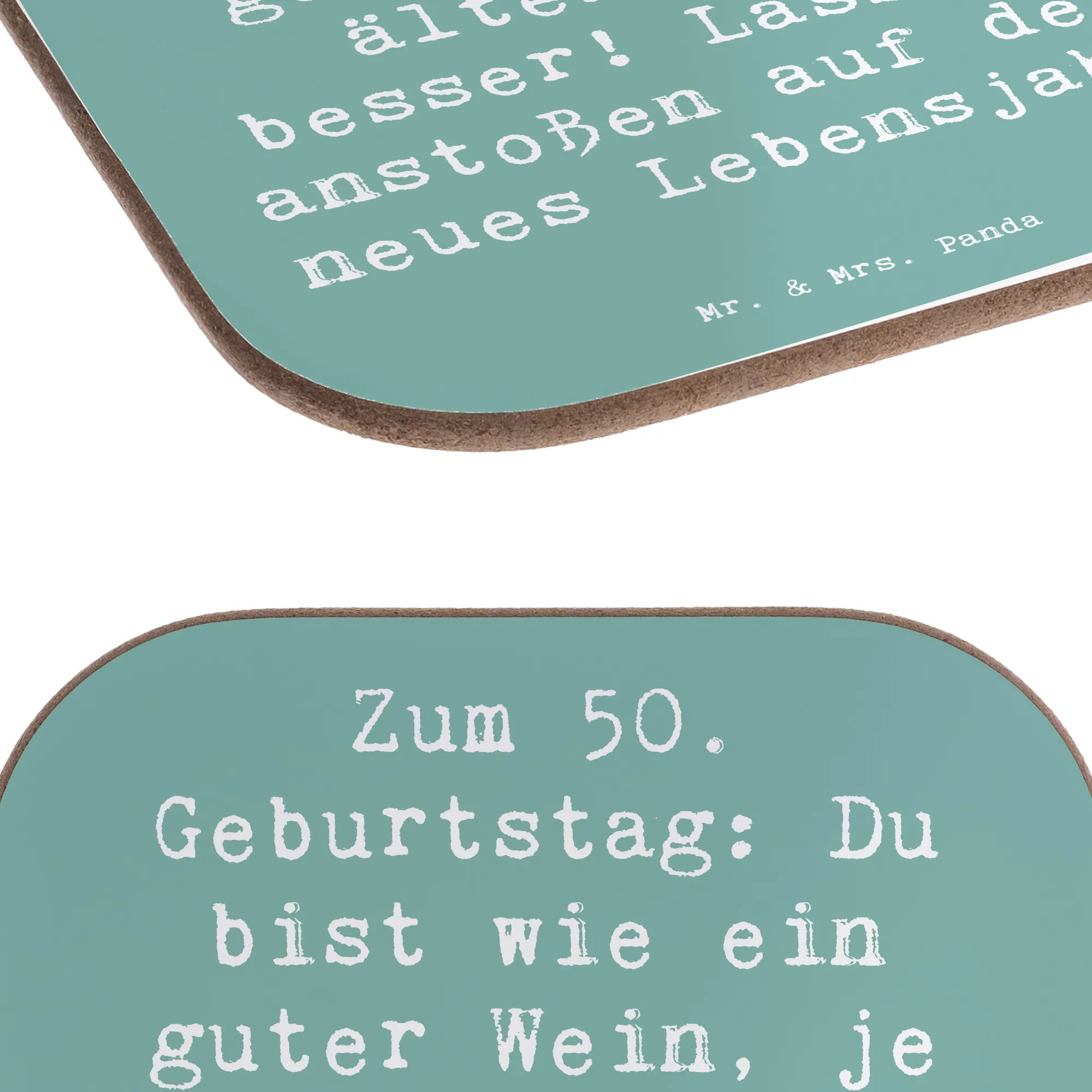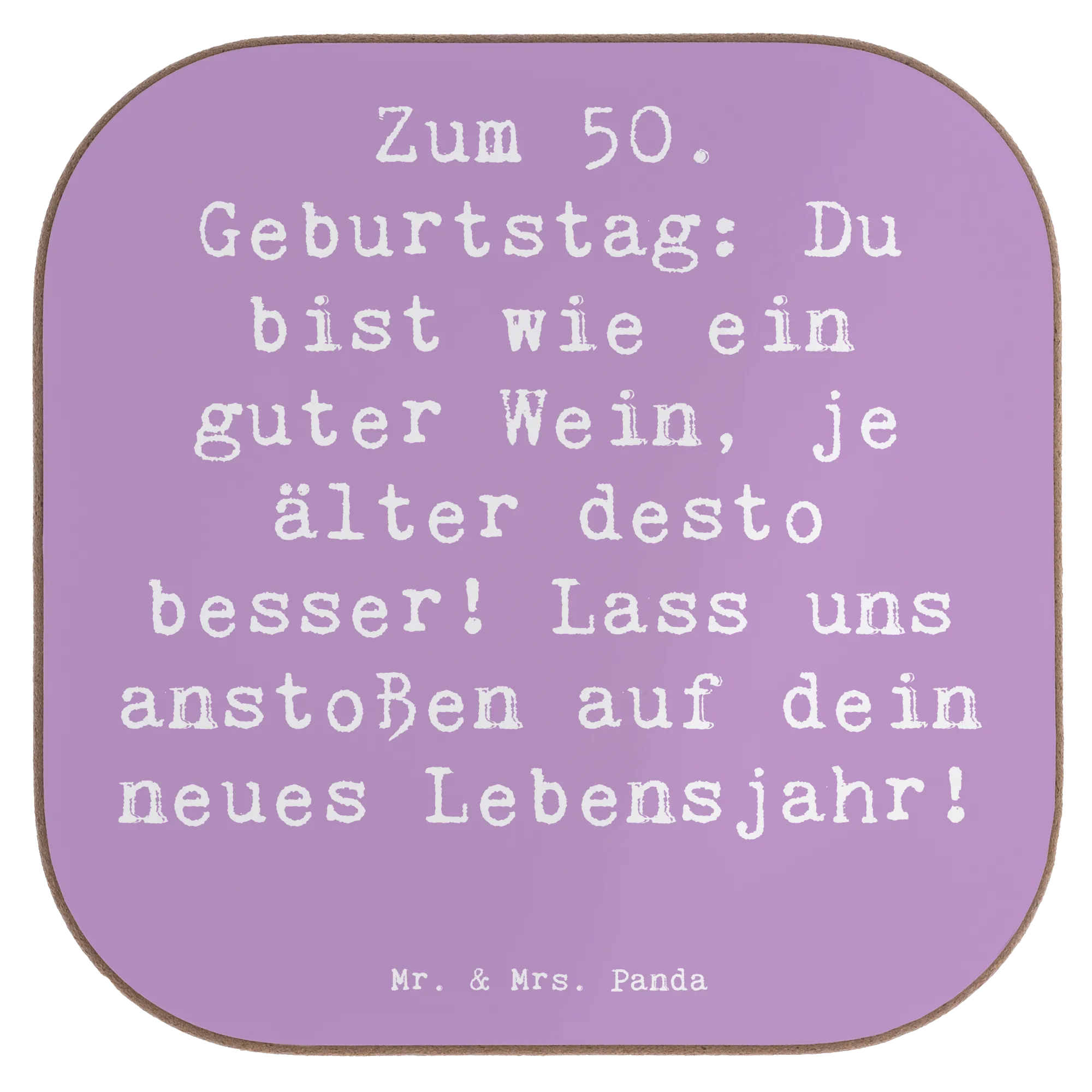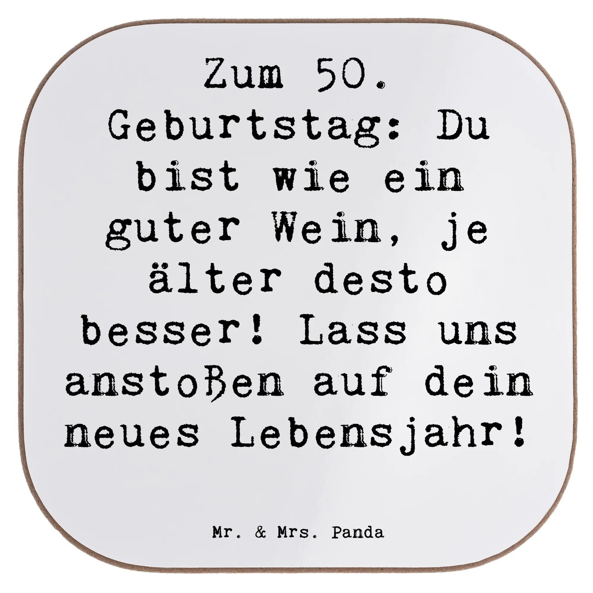 Dieser quadratische Untersetzer von Mr. & Mrs. Panda ist das perfekte Geschenk für den runden Geburtstag. Bedruckt mit dem fröhlichen Spruch „Zum 50. Geburtstag: Du bist wie ein guter Wein, je älter desto besser! Lass uns anstoßen auf dein neues Lebensjahr!” bringt er gute Laune auf jeden Tisch – ob bei der Geburtstagsfeier, im Garten beim Grillen oder gemütlich bei Kaffee und Kuchen.
