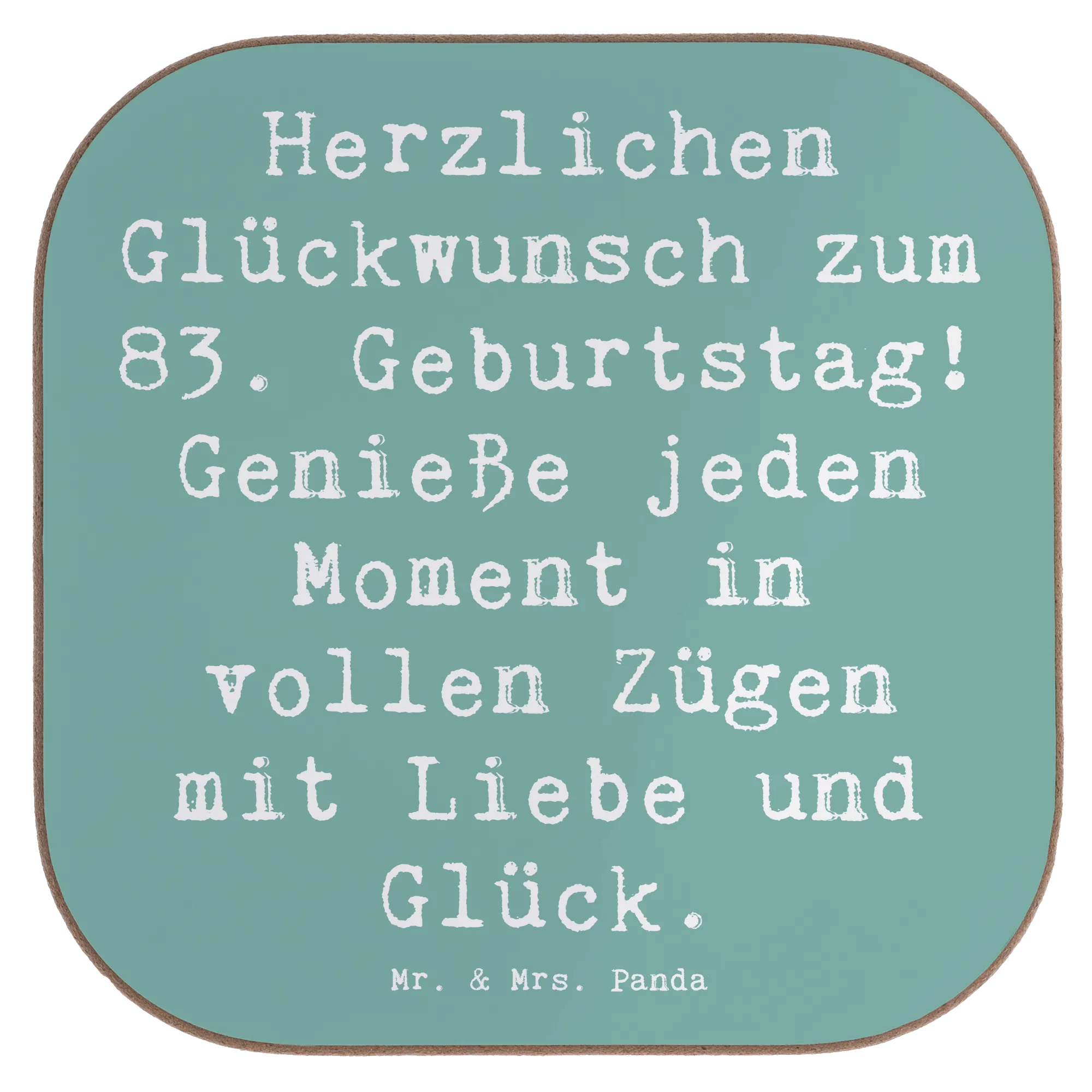 Unser quadratischer Untersetzer von Mr. & Mrs. Panda mit dem Slogan „Herzlichen Glückwunsch zum 83. Geburtstag! Genieße jeden Moment in vollen Zügen mit Liebe und Glück.“ ist das ideale Geschenk für alle, die einem besonderen Menschen eine kleine Freude machen wollen. Der Spruch steht im Mittelpunkt und bringt viel Herzlichkeit auf den Tisch.