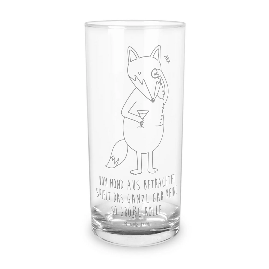 Unser klares, elegantes Trinkglas ist liebevoll gestaltet und trägt das fröhliche Fuchs-Motiv „Fuchs Lord“: ein stattlicher, niedlicher Fuchs mit Monokel, handgezeichnet von Mrs. Panda. Dazu der feinsinnige Spruch: „Vom Mond aus betrachtet spielt das Ganze gar keine so große Rolle.“ – ein kleiner Reminder, gelassen zu bleiben und das Leben mit einem Lächeln zu betrachten. 😊