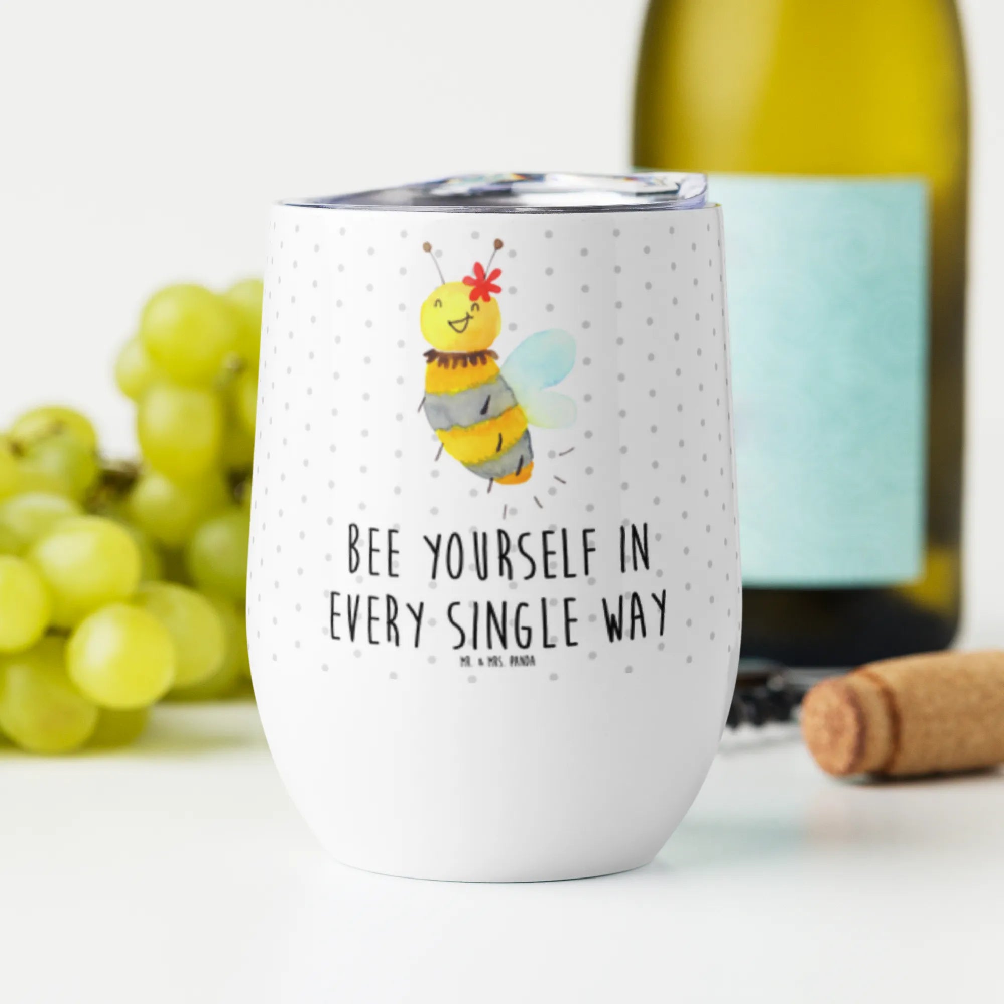 Ob als Geschenk zum Geburtstag, zur Hochzeit oder einfach für einen lieben Menschen – dieser Weinbecher ist eine tolle Überraschung, die jedem ein Lächeln ins Gesicht zaubern wird. Die Bienen Kollektion von Mr. & Mrs. Panda bietet zahlreiche Produkte, die mit ebenso liebevollen Motiven und Sprüchen versehen sind.