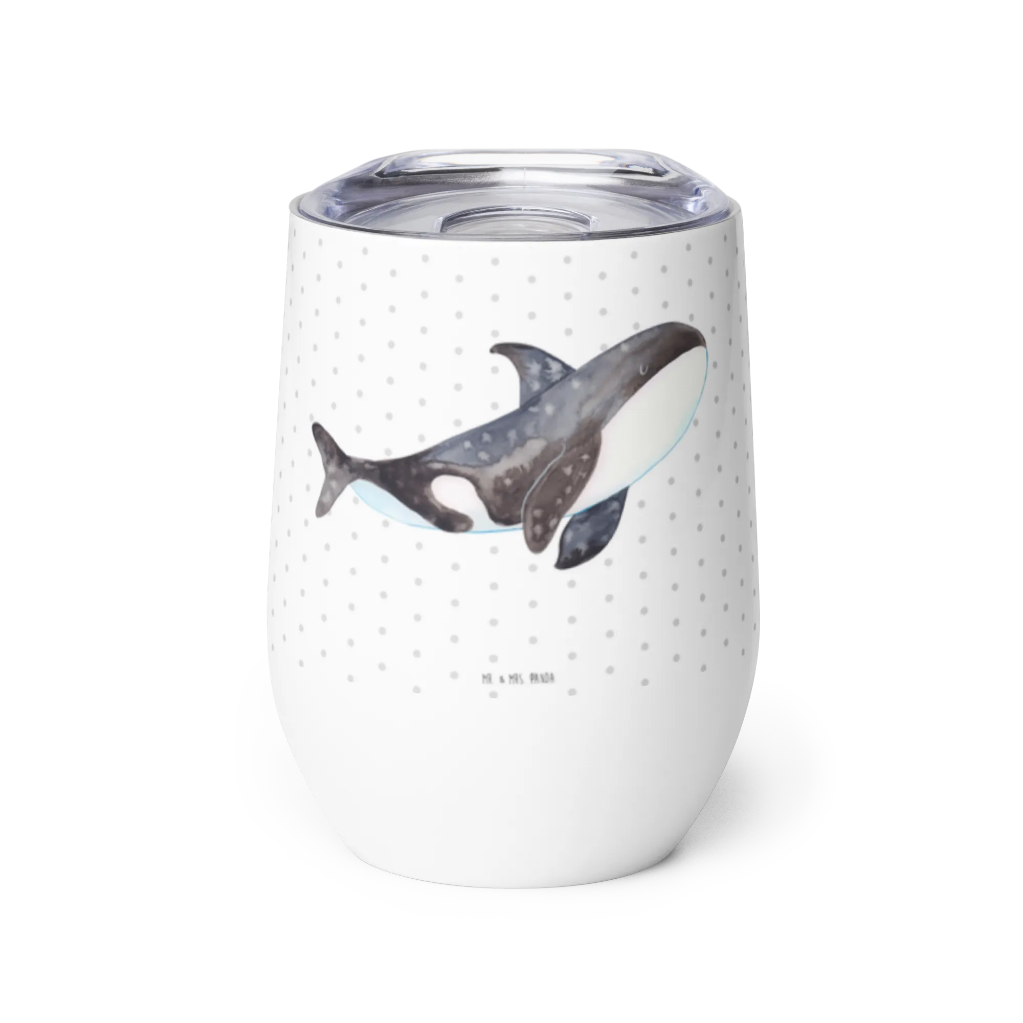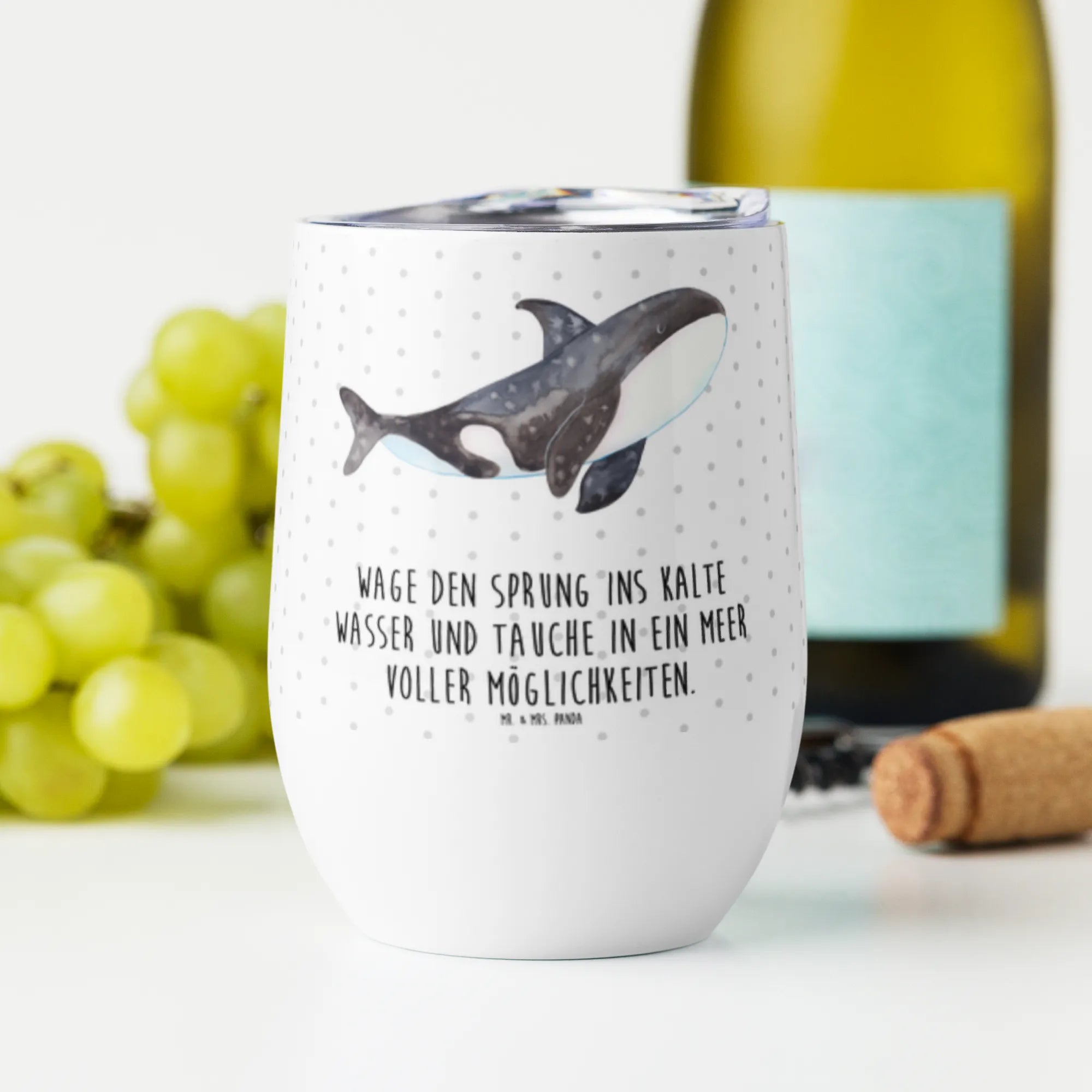 Nimm ihn mit in das Büro, auf Reisen oder einfach zum Picknick mit Freunden. Dein Weinbecher begleitet Dich überall hin! Das wunderschöne Motiv zeigt unseren Orca in nostalgischen, weichen Aquarelltönen, die an den Ozean erinnern. Mit einem begleitenden Spruch wie 'Wage den Sprung ins kalte Wasser und tauche in ein Meer voller Möglichkeiten' inspiriert dieser Becher dazu, das Leben zu genießen und neue Wege zu gehen.