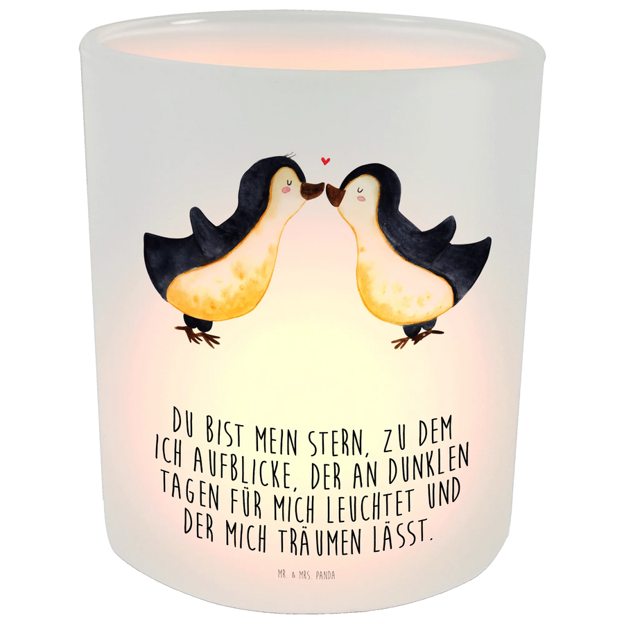 Ein wunderschönes, edles Windlicht von Mr. & Mrs. Panda, das sich perfekt als Geschenk für Verliebte eignet. Mit dem zauberhaften Motiv der Pinguin Liebe ist dieses Teelichtglas ein wahres Highlight für jeden Anlass. Die glücklichen Pinguine, die sich sanft an den Schnäbeln berühren, strahlen pure Zuneigung und Verbundenheit aus.
