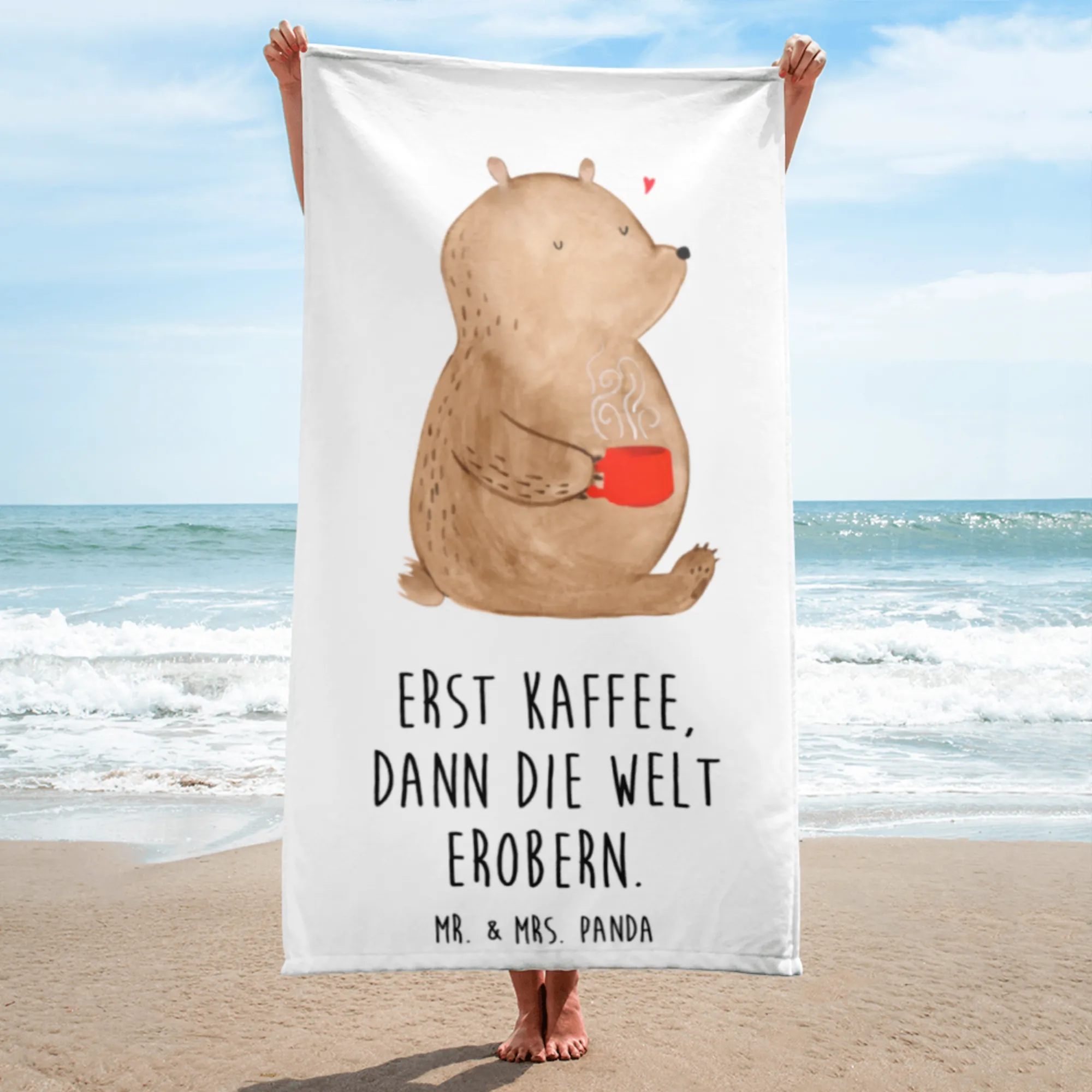 Das XL Badehandtuch mit dem süßen Bären-Motiv Kaffee von Mr. & Mrs. Panda ist das perfekte Geschenk für alle Kaffee-Liebhaber und Bären-Fans! Mit seinen großzügigen Maßen von 1520 mm x 760 mm ist es ideal zum Entspannen am Strand, im Schwimmbad oder in der Sauna.