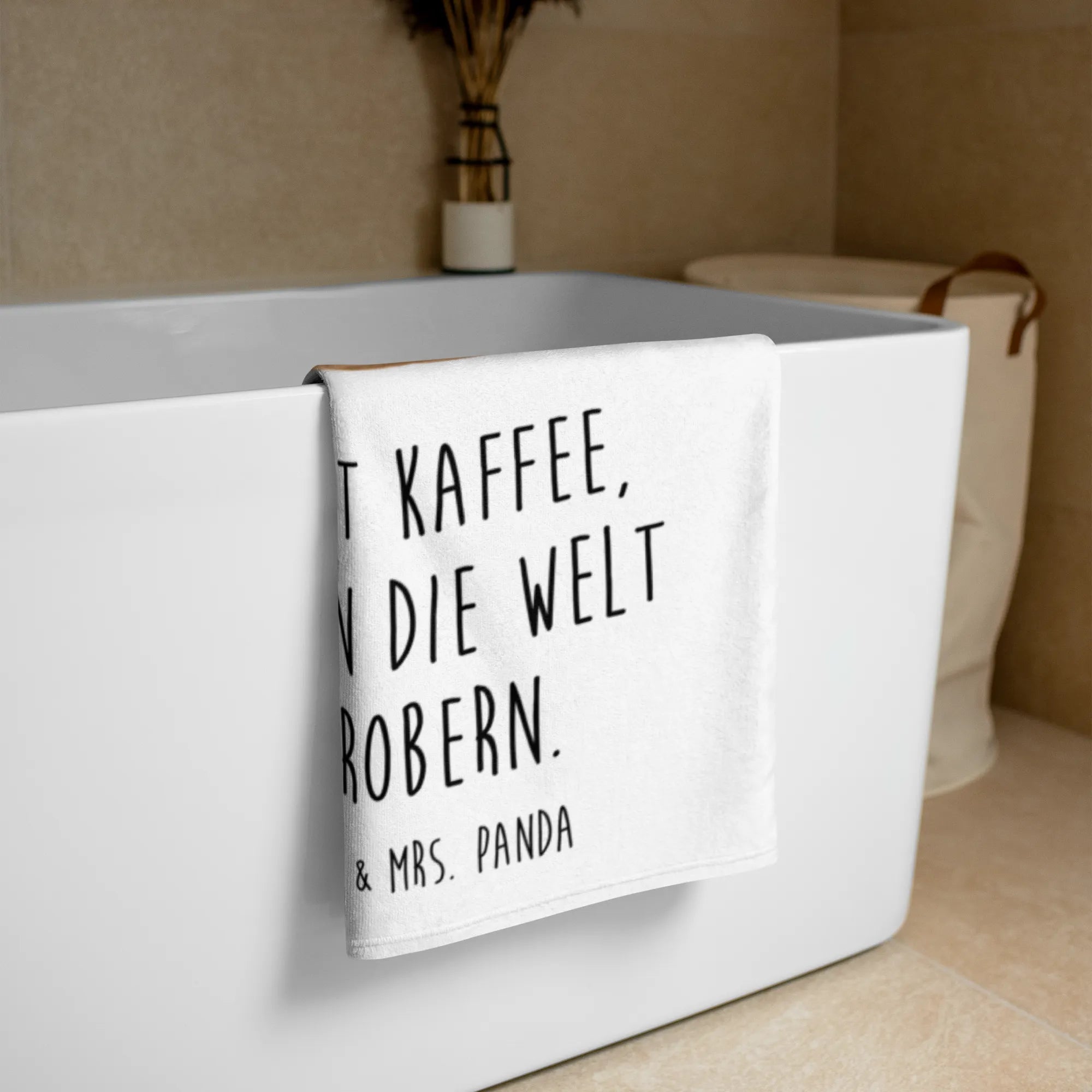 Das besondere an diesem Handtuch? Es trägt den motivierenden Slogan: „Erst Kaffee, dann die Welt erobern!” – perfekt für alle Kaffeeliebhaber und Motivationsfanatiker!