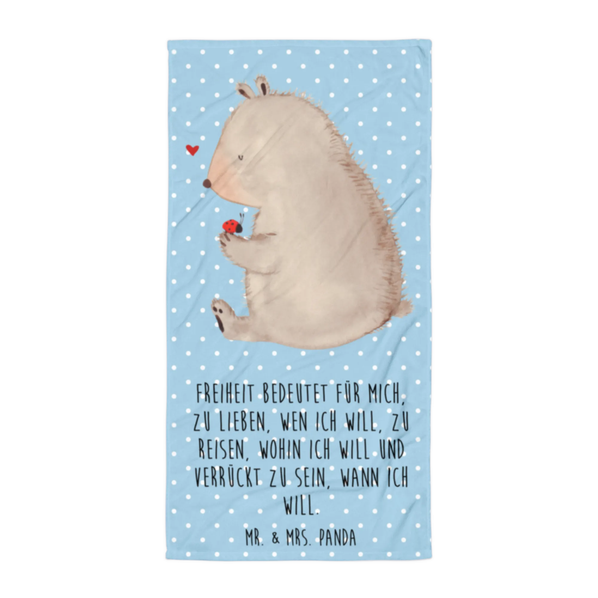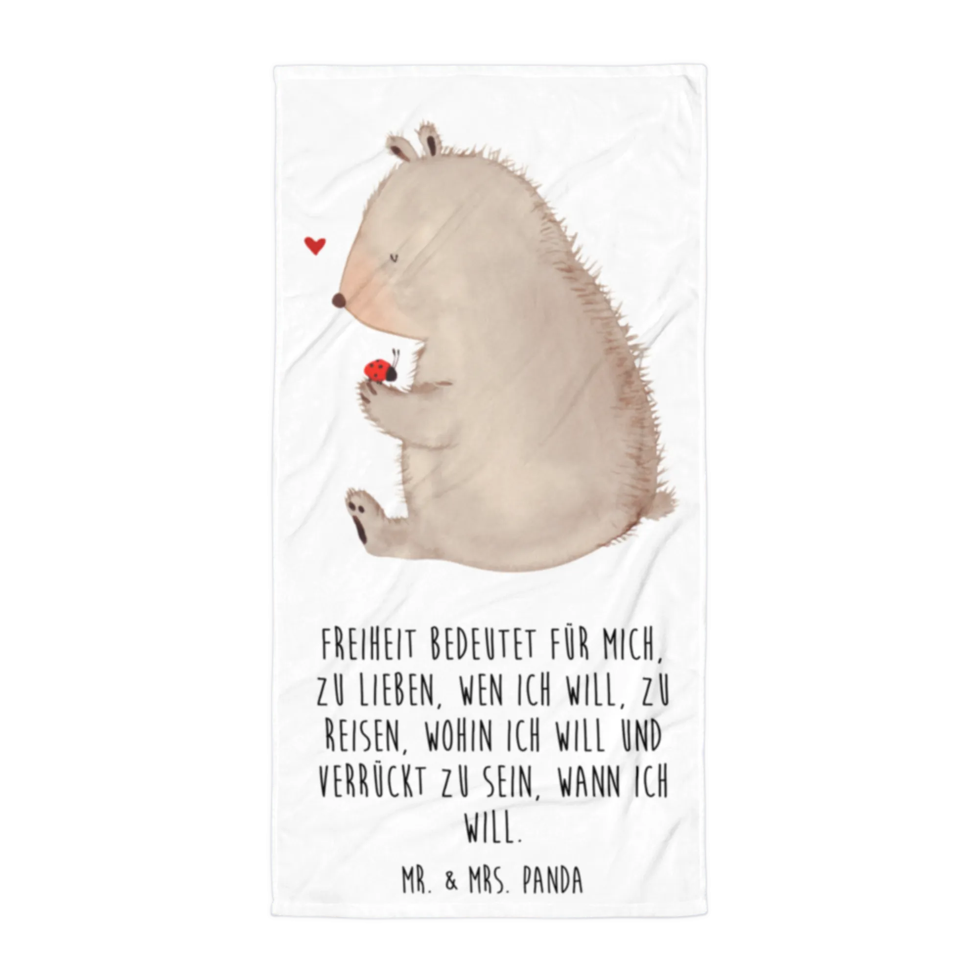 Unser XL Badehandtuch „Bär mit Marienkäfer“ von Mr. & Mrs. Panda ist mehr als nur ein Handtuch – es ist ein kleines Glücksgefühl für Strand, Sauna und Wellness. Das liebevoll illustrierte Motiv zeigt einen süßen Bär am Lagerfeuer, der mit seinem Marienkäfer-Freund Marshmallows grillt. Der lebensfrohe Spruch „Freiheit bedeutet für mich, zu lieben, wen ich will, zu reisen, wohin ich will und verrückt zu sein, wann ich will.“ macht das Motiv noch persönlicher und inspirierender.