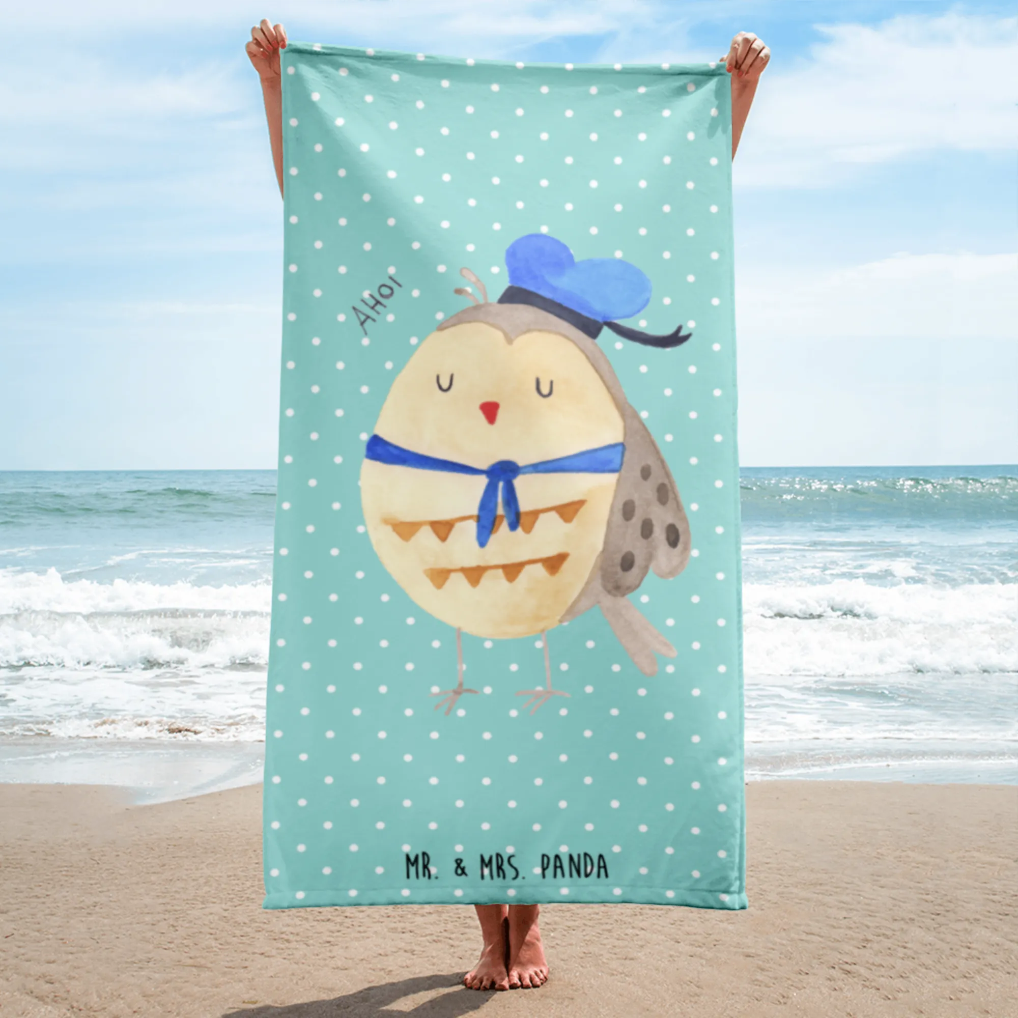 Du möchtest deinen Strandtag oder Saunabesuch etwas aufpeppen? Dann ist unser XL Badehandtuch Eule Matrosen aus der einzigartigen Eulen-Kollektion von Mr. & Mrs. Panda genau das Richtige für dich! Voller Lebensfreude wurde dieses Handtuch mit einer süßen Eule im Matrosenhut gestaltet, die dir mit ihrem treuen Blick ein Lächeln ins Gesicht zaubert.