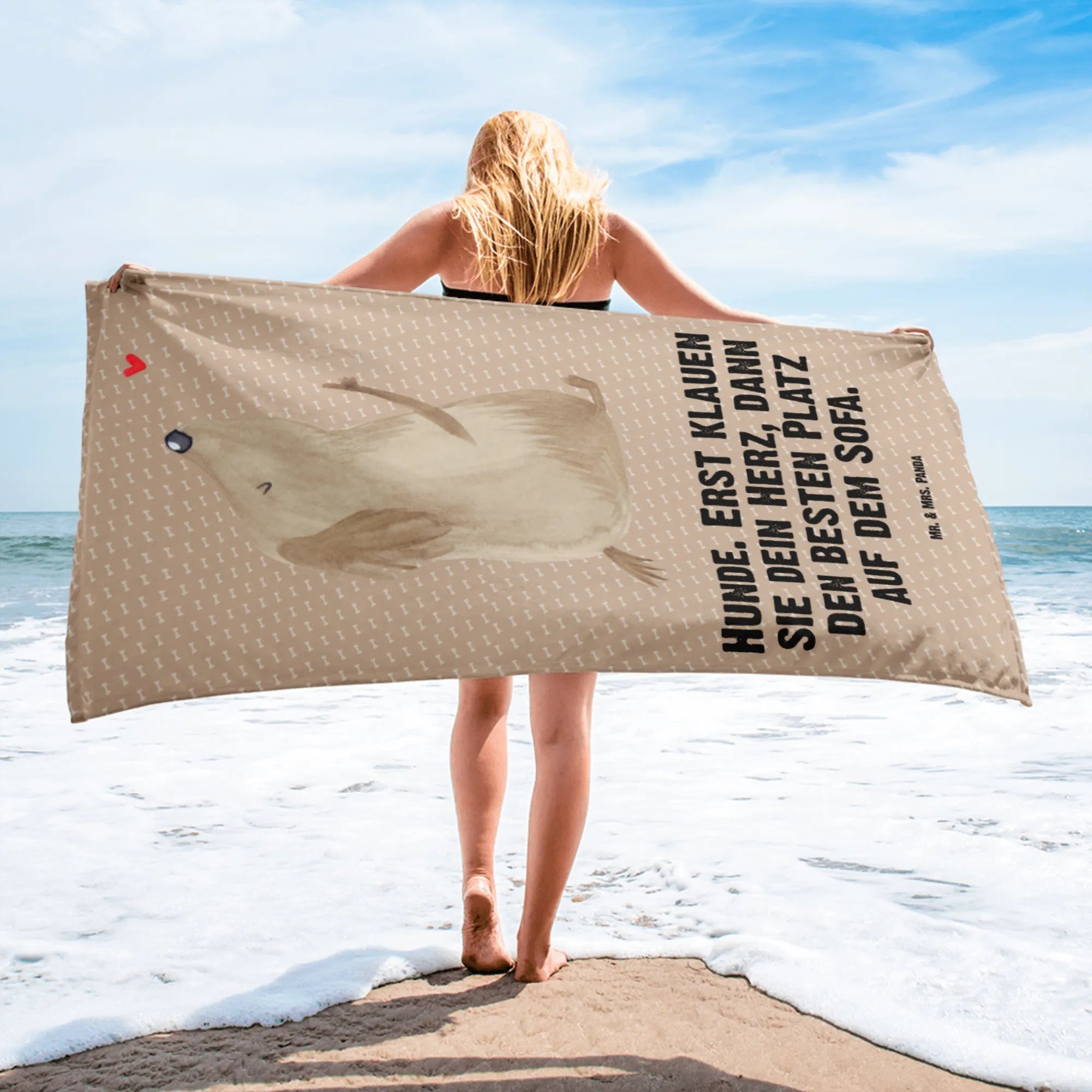 Verwöhne dich selbst oder andere Hundeliebhaber mit diesem wundervollen Badehandtuch von Mr. & Mrs. Panda - ein ideales Geschenk, das von Herzen kommt! Es ist nicht nur für Hundebesitzer ein Muss, sondern auch für jeden, der Hunde liebt und gerne Zeit am Wasser verbringt. Zeige deinen Hund, dass er immer in deinem Herzen ist, und genieß jeden Moment am Strand oder Pool mit diesem besonderen Handtuch!