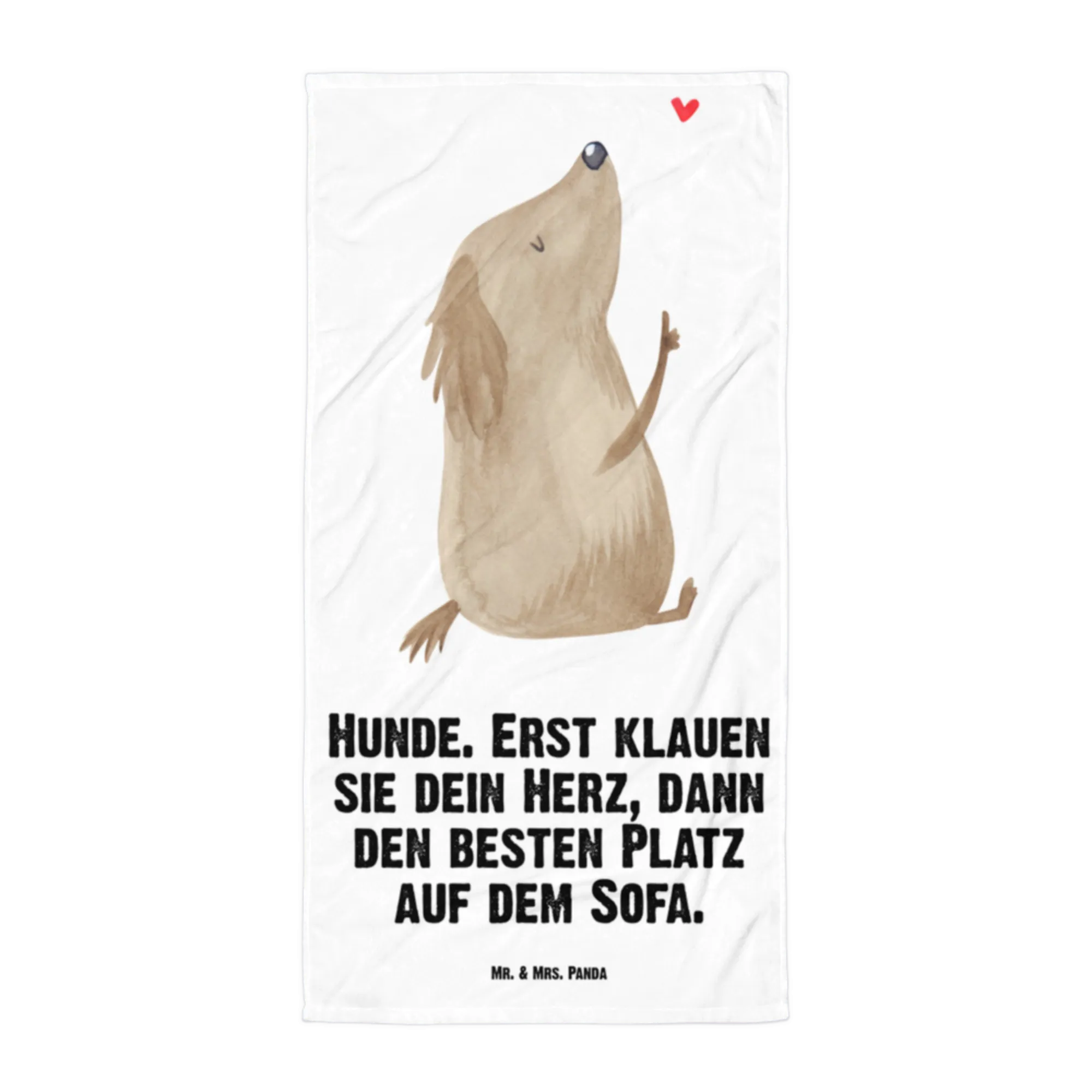 Mit dem lustigen Spruch 'Hunde. Erst klauen sie dein Herz, dann den besten Platz auf dem Sofa.' wird jeder Tag ein wenig schöner. Das Handtuch hat Maße von 1520 mm x 760 mm und eignet sich perfekt für jede Gelegenheit.