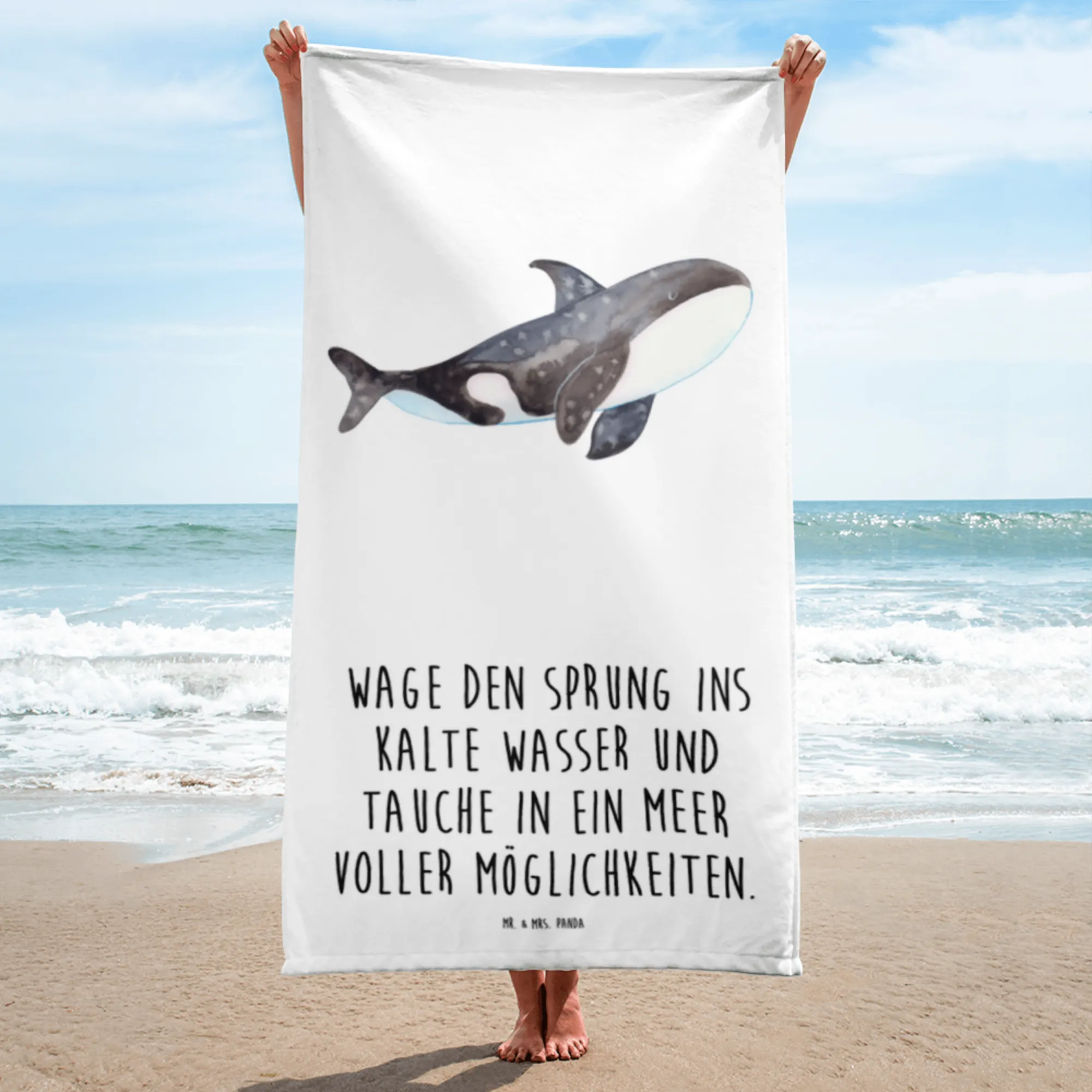 Das XL Badehandtuch von Mr. & Mrs. Panda mit dem bezaubernden Orca-Motiv ist der perfekte Begleiter für Deinen Tag am Strand, im Schwimmbad oder in der Sauna.
