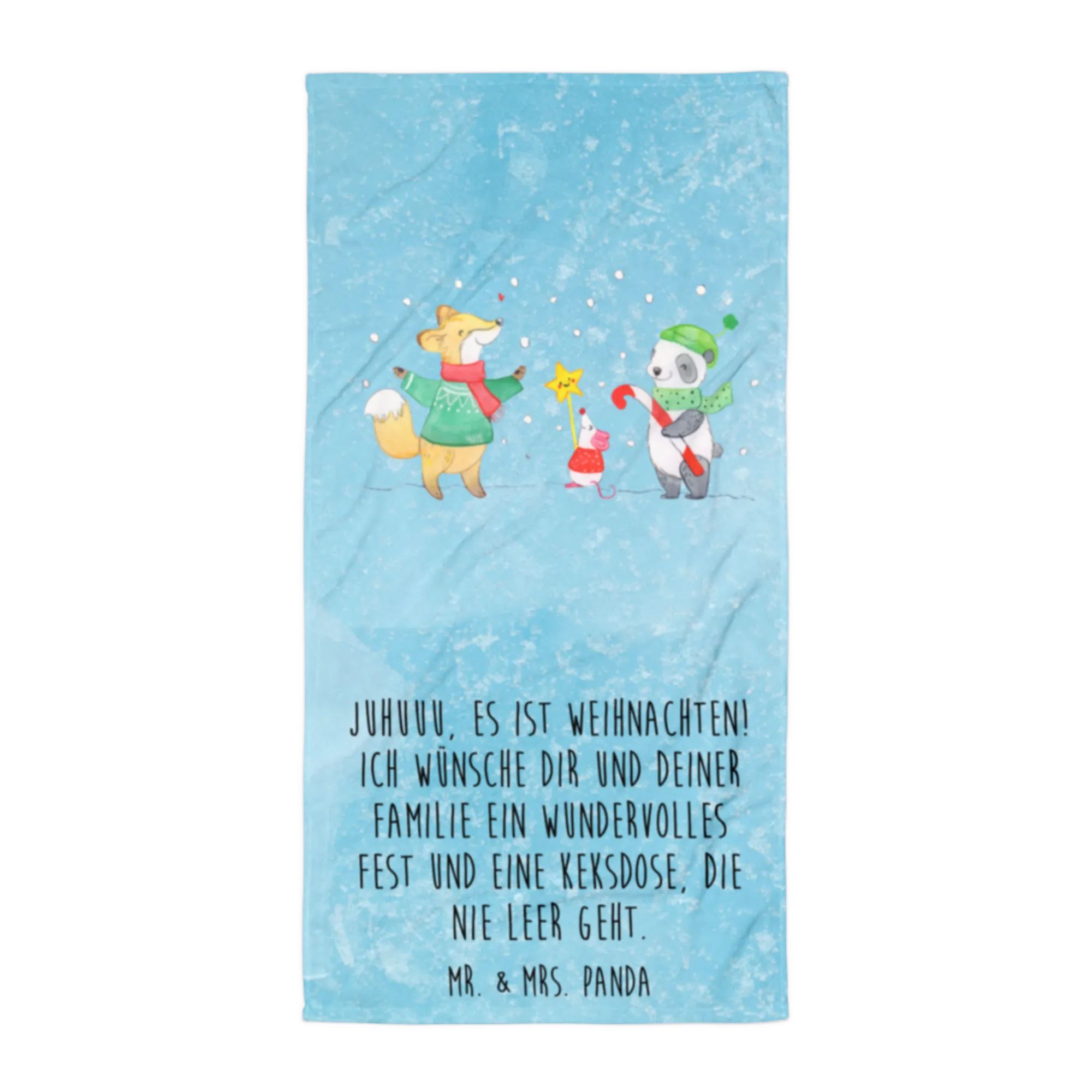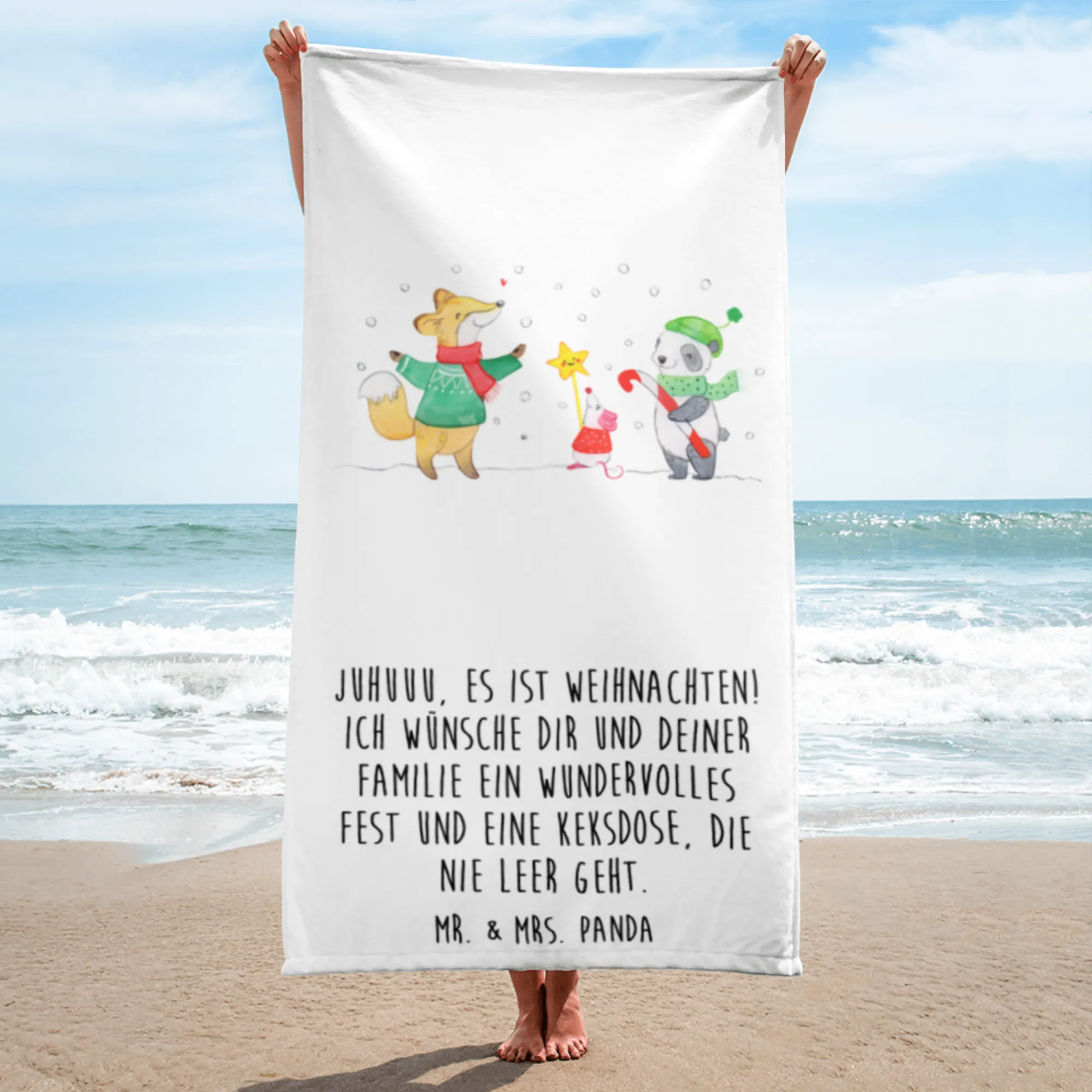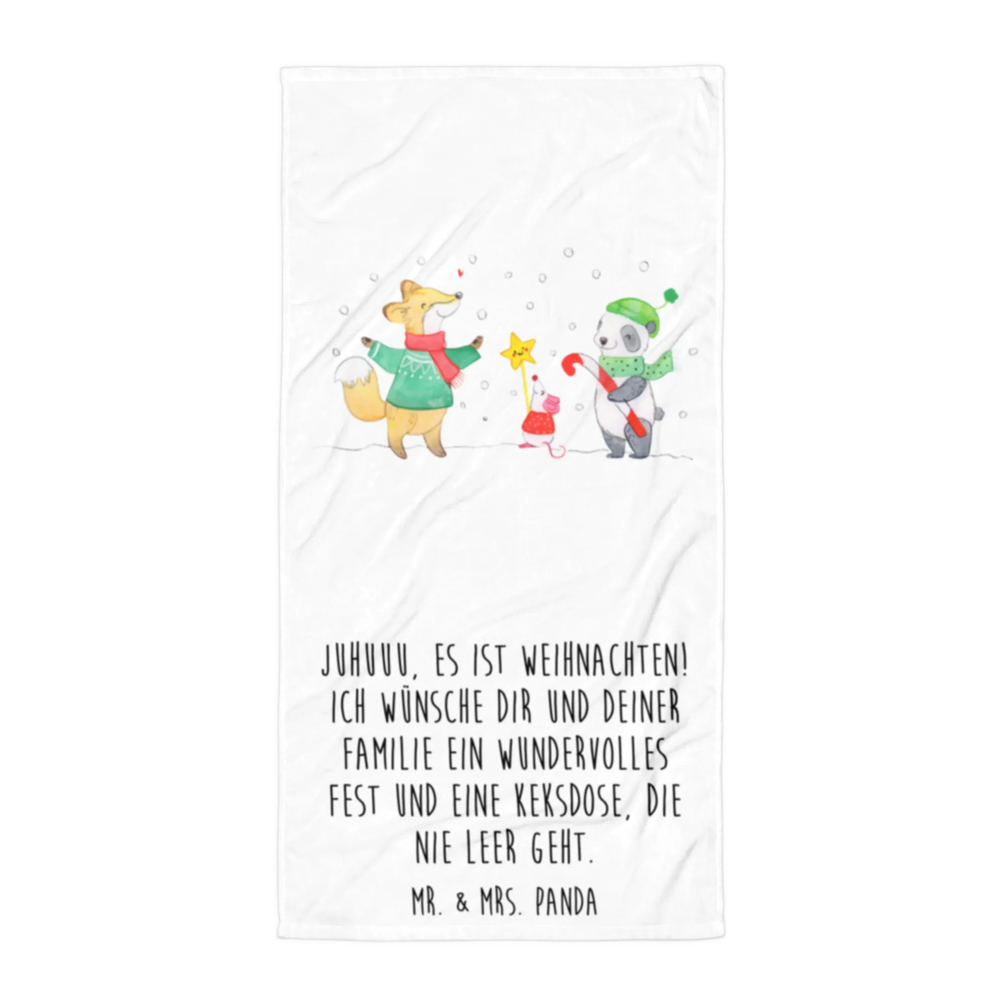 Das XL Badehandtuch "Winter Weihnachtsfreude" von Mr. & Mrs. Panda ist das perfekte Geschenk für die kalte Jahreszeit! Flauschig und einladend, versprüht dieses Handtuch die fröhliche Stimmung der Weihnachtszeit. Mit seiner liebevollen Gestaltung, die einen Fuchs, eine Maus und einen Panda in Schals und Mützen im Schnee zeigt, bringt es jeden zum Lächeln. Der Slogan "Juhuuu, es ist Weihnachten! Ich wünsche dir und deiner Familie ein wundervolles Fest und eine Keksdose, die nie leer geht." sorgt für gute Laune und macht dieses Handtuch zu einem ganz besonderen Geschenk oder einer tollen Dekoration für dein Badezimmer.