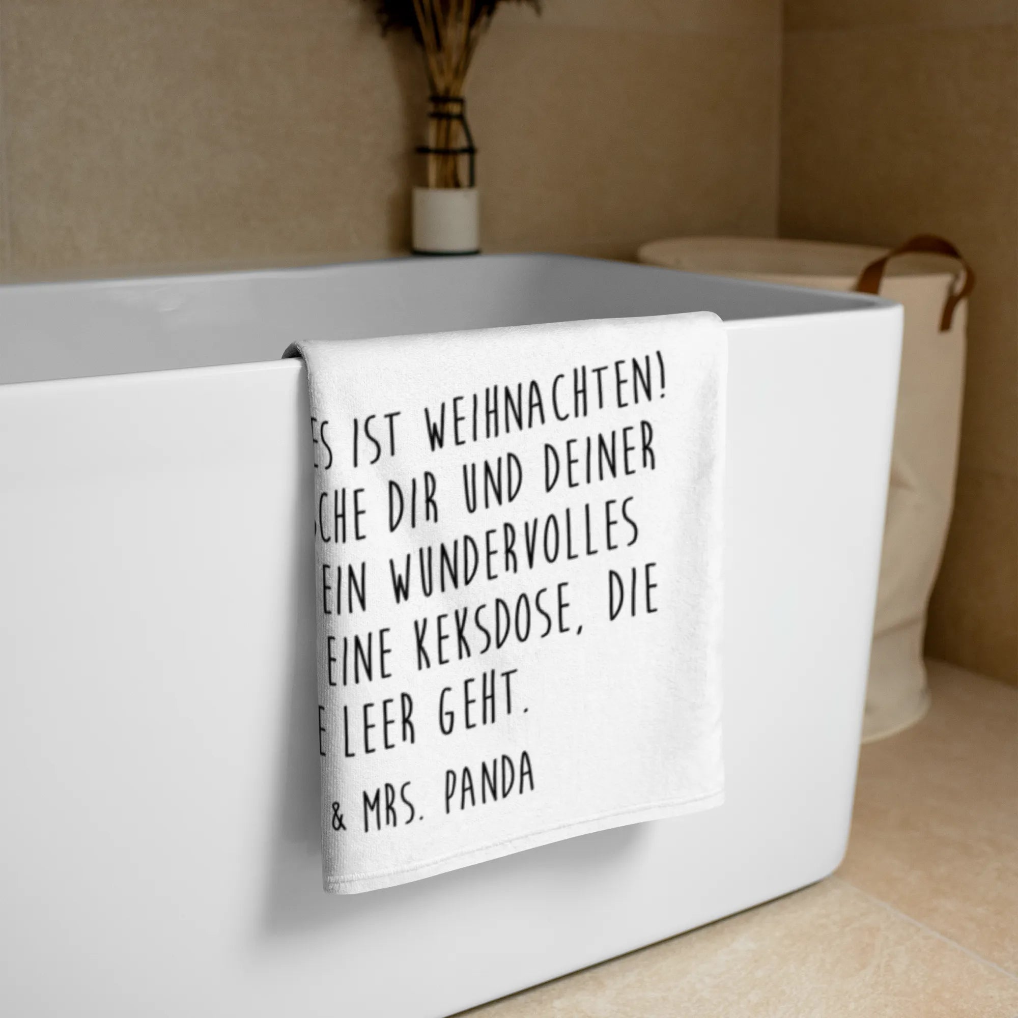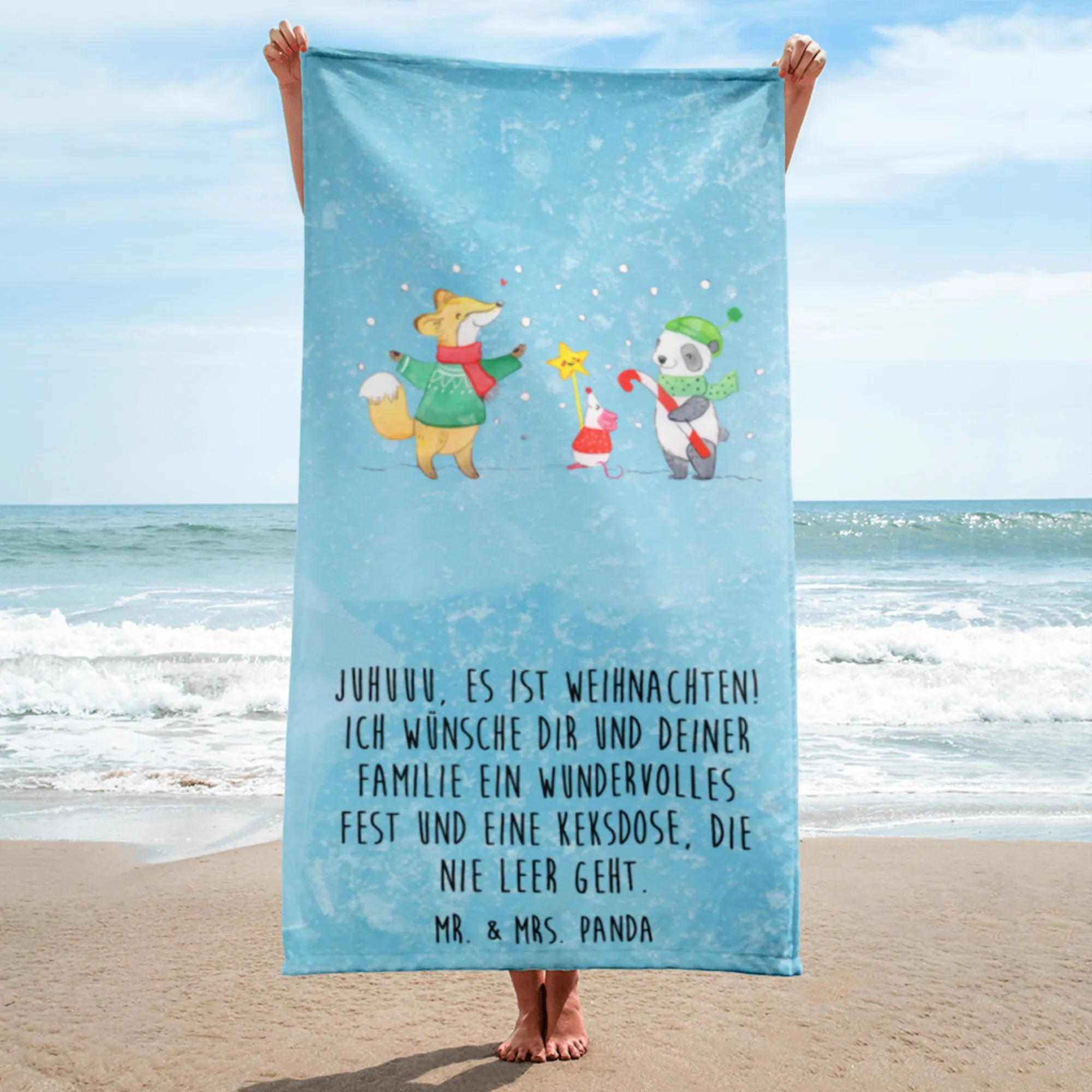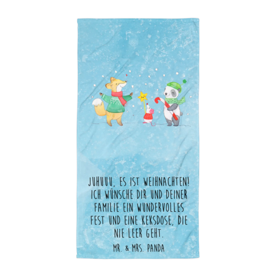 Das XL Badehandtuch "Winter Weihnachtsfreude" von Mr. & Mrs. Panda ist das perfekte Geschenk für die kalte Jahreszeit! Flauschig und einladend, versprüht dieses Handtuch die fröhliche Stimmung der Weihnachtszeit. Mit seiner liebevollen Gestaltung, die einen Fuchs, eine Maus und einen Panda in Schals und Mützen im Schnee zeigt, bringt es jeden zum Lächeln. Der Slogan "Juhuuu, es ist Weihnachten! Ich wünsche dir und deiner Familie ein wundervolles Fest und eine Keksdose, die nie leer geht." sorgt für gute Laune und macht dieses Handtuch zu einem ganz besonderen Geschenk oder einer tollen Dekoration für dein Badezimmer.