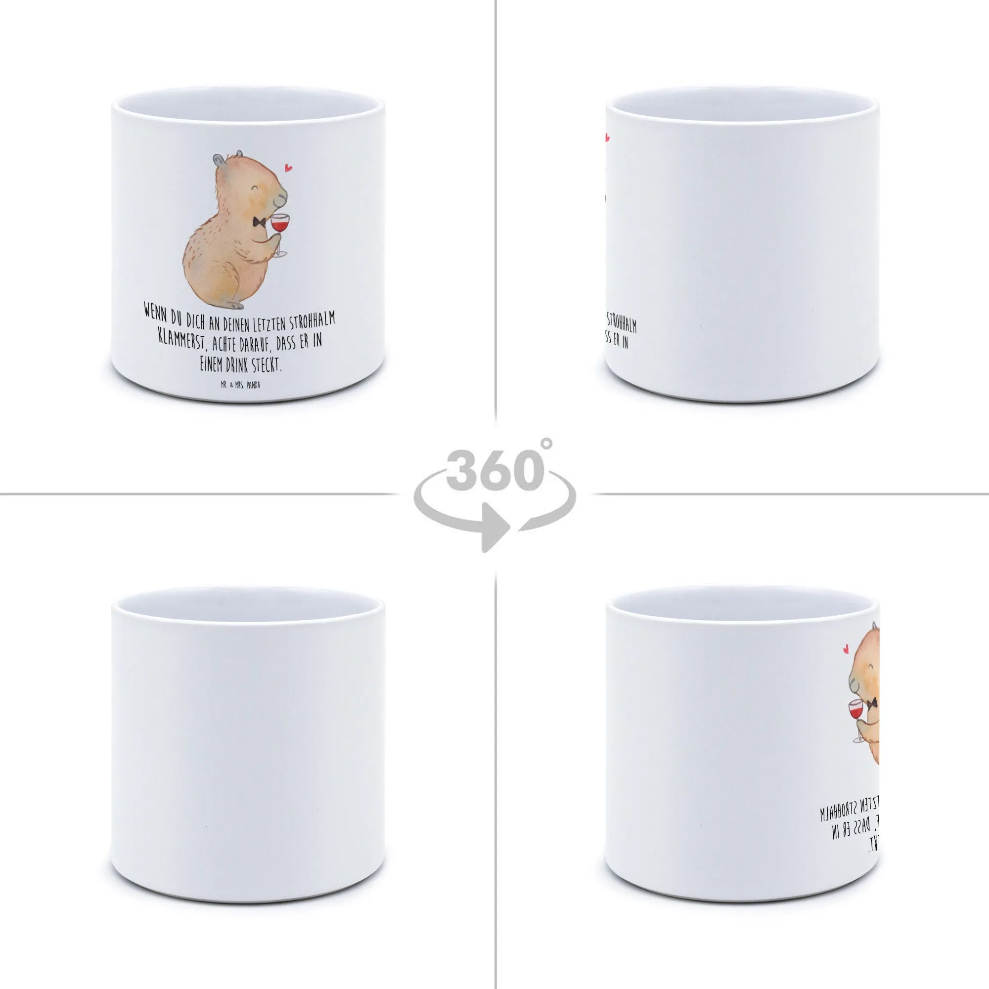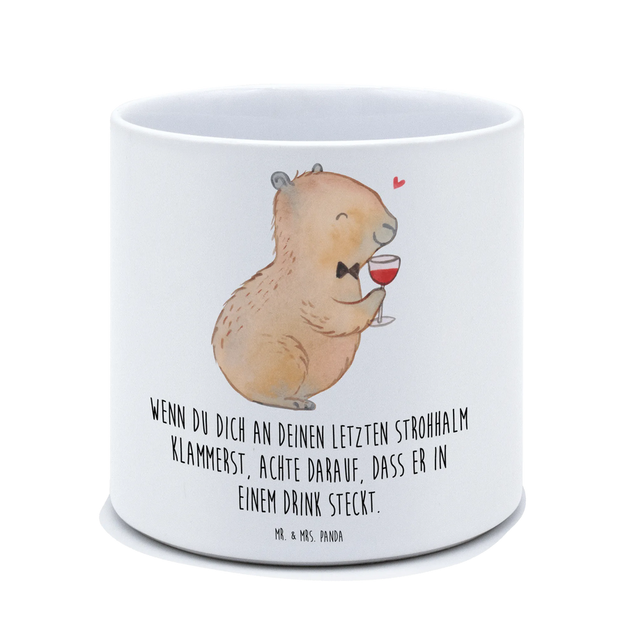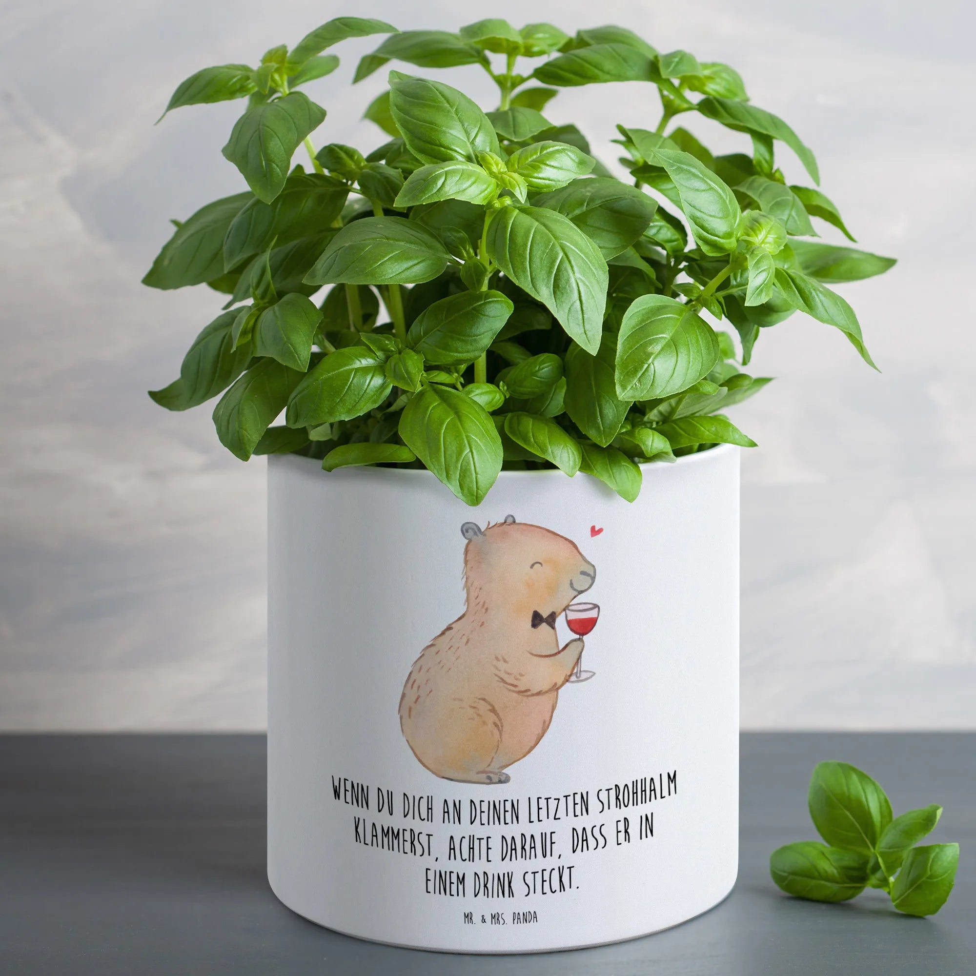 Der XL Blumentopf "Capybara Wein" von Mr. & Mrs. Panda ist mehr als nur ein Pflanztopf – er ist ein Statement der Lebensfreude und eine Hommage an die kleinen Genussmomente des Lebens. Mit einem charmanten Capybara, das genüsslich sein Glas Wein hält, und einem herzerfrischenden Spruch "Wenn du dich an deinen letzten Strohhalm klammerst, achte darauf, dass er in einem Drink steckt", bringt dieser Pflanztopf gute Laune in jeden Raum.