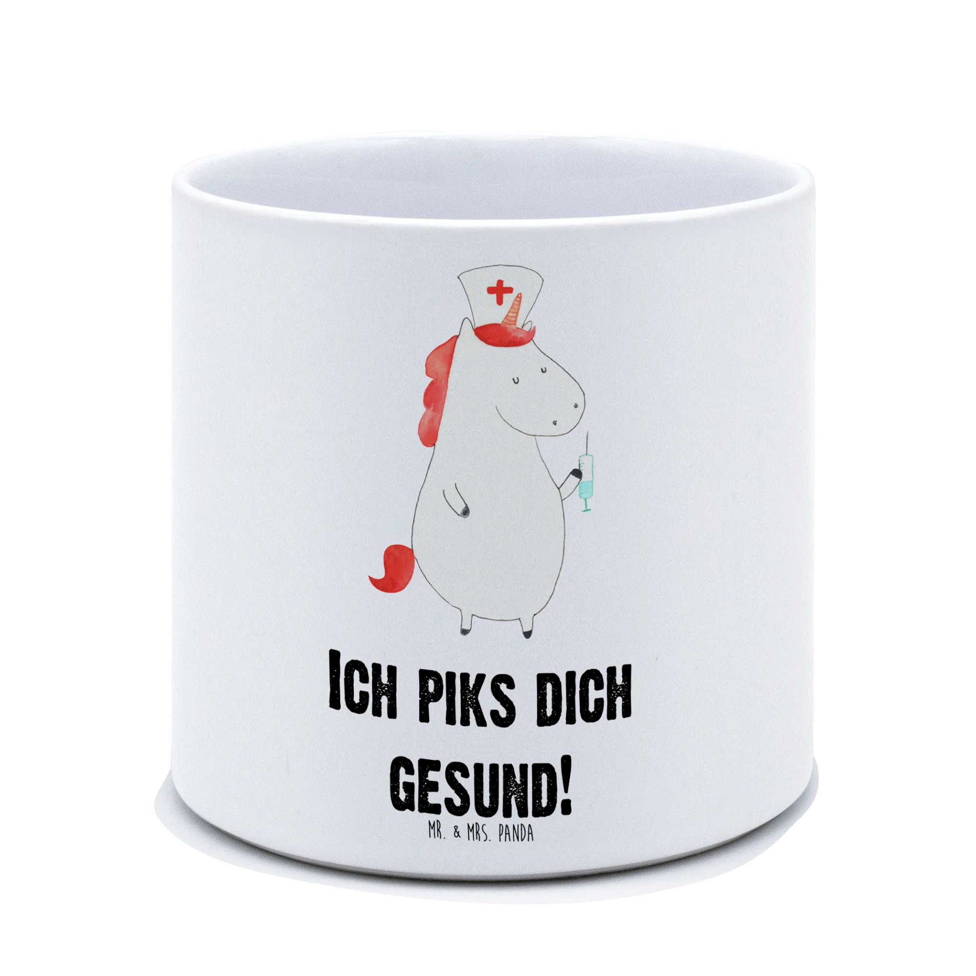 Die bezaubernde Illustration von Mrs. Panda zeigt ein fröhliches Einhorn in weiß, das als Krankenschwester verkleidet ist. Mit dem Slogan "Ich piks dich gesund!" bringt er ein Lächeln ins Gesicht und eignet sich hervorragend als Deko-Element in der Wohnung oder als Geschenk für eine Pflegekraft. Ob zu einem Feiertag, zum Dankeschön für die harte Arbeit, zum Geburtstag oder einfach nur so, dieses spritzige Design macht den Topf zu einem echten Hingucker. Die Sprüche und Motive aus der Einhorn-Kollektion sind handgezeichnet und strahlen Lebensfreude und Humor aus.