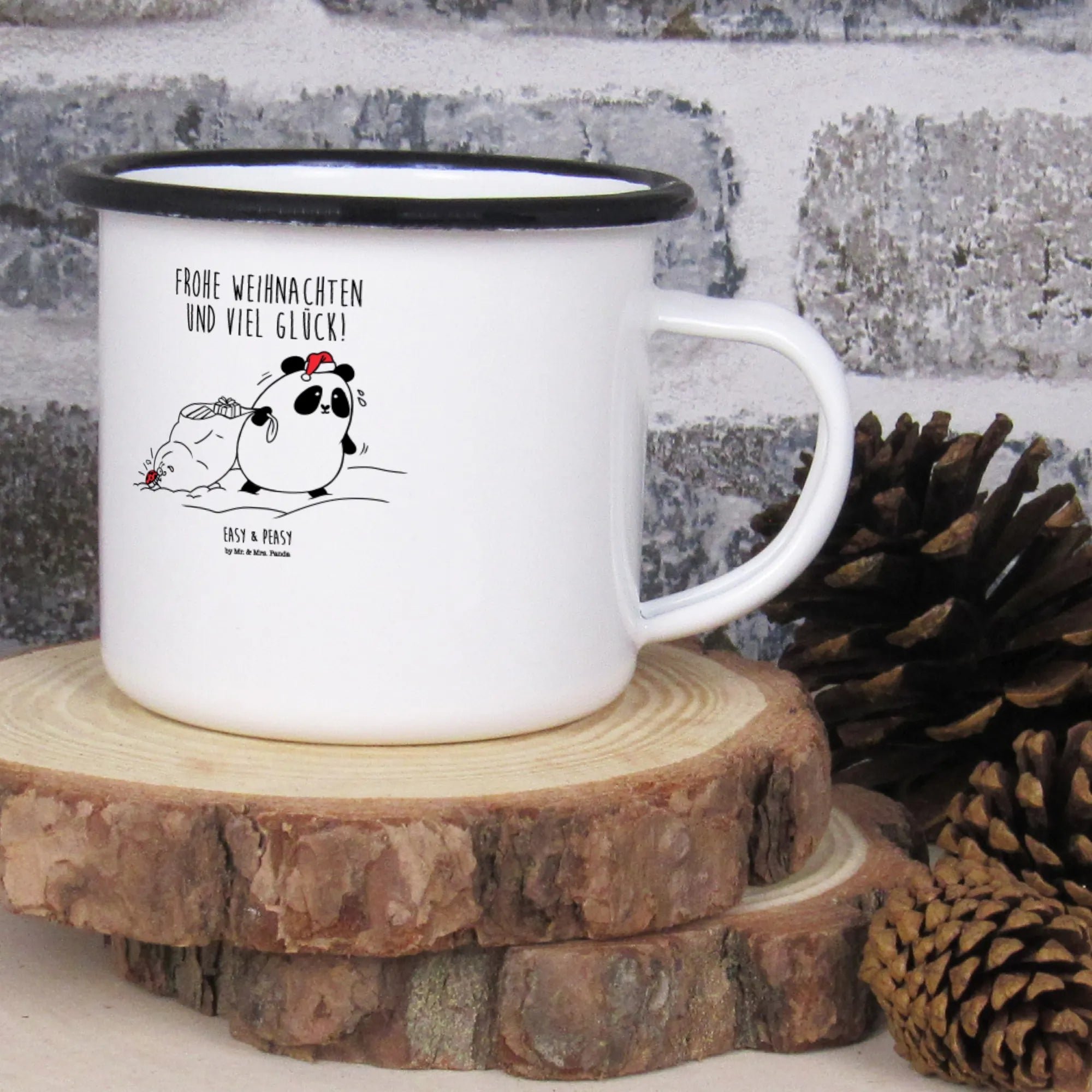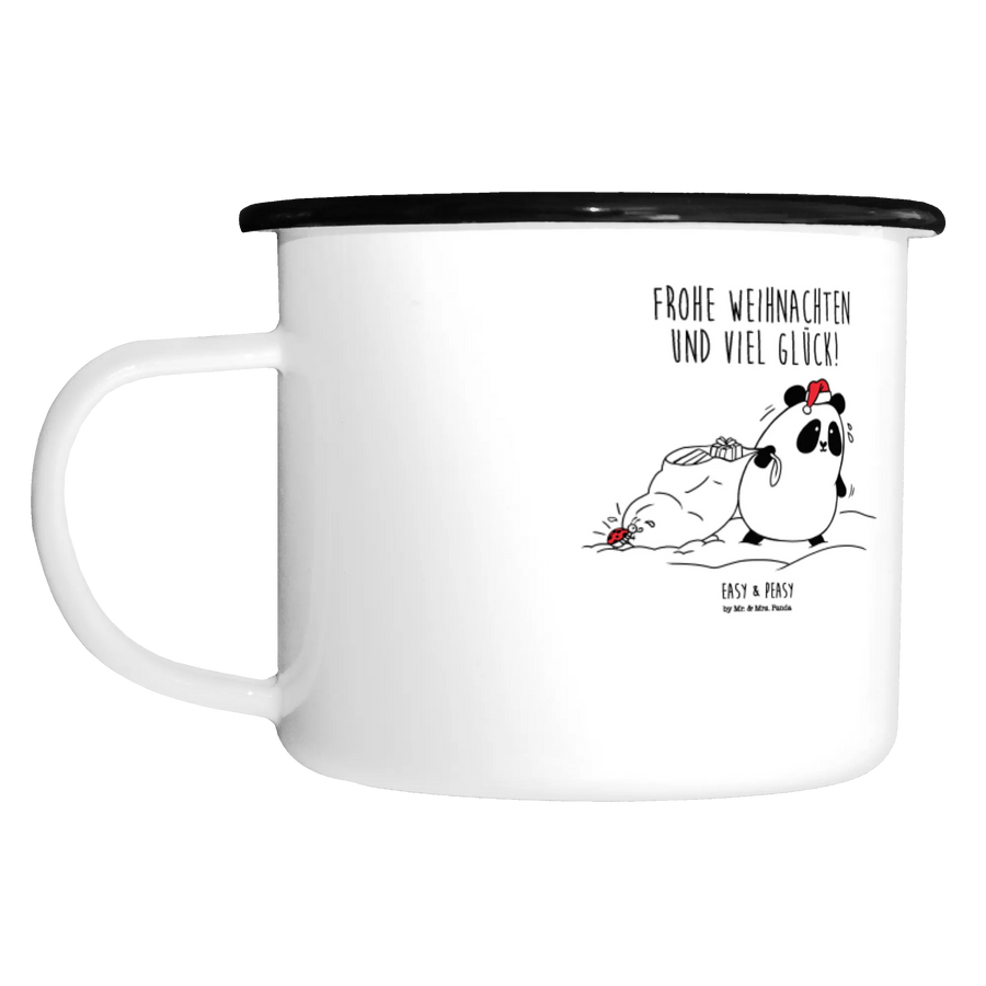 Die XL Emaille Tasse "Easy & Peasy Frohe Weihnachten" von Mr. & Mrs. Panda ist das perfekte Geschenk für alle, die in der besinnlichen Jahreszeit ihre Liebe und Freude zum Ausdruck bringen möchten. Diese stabile und wunderschöne Metalltasse hat ein Füllvolumen von 450 ml und bietet ausreichend Platz für deine heißgeliebten Getränke, egal ob Tee, Kaffee oder Glühwein. Der niedliche Motive zeigt einen süßen Panda, der sich als Nikolaus verkleidet hat und mit einem großen Sack voller Geschenke umherzieht. Ein kleiner Marienkäfer hilft ihm dabei, den Sack zu bewegen, und sorgt so für extra niedliche Weihnachtsstimmung.